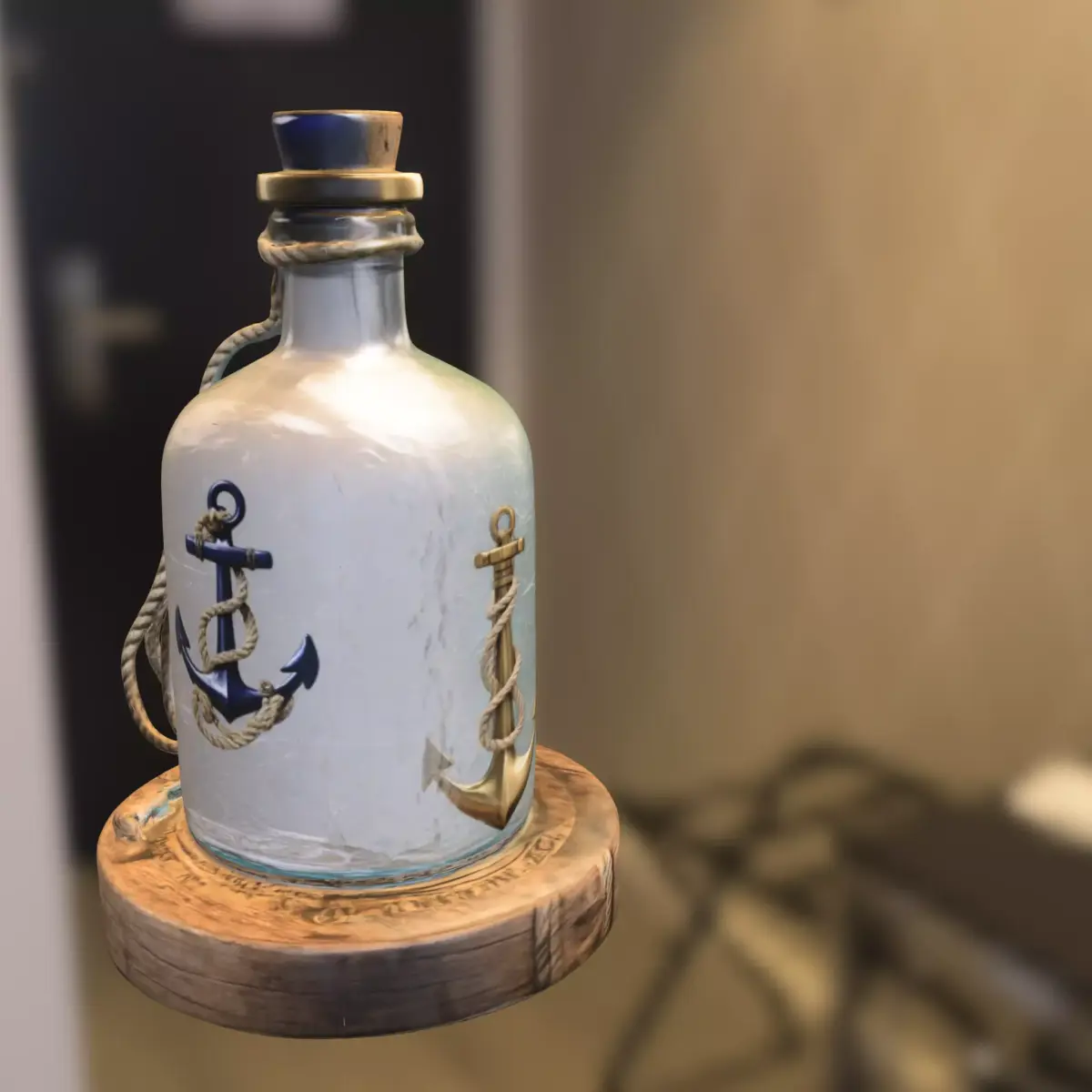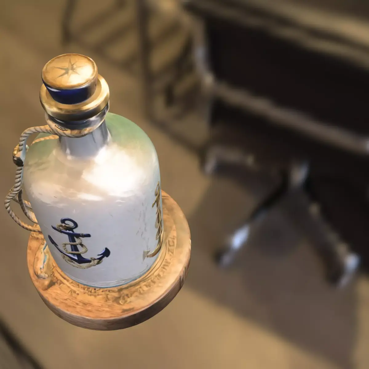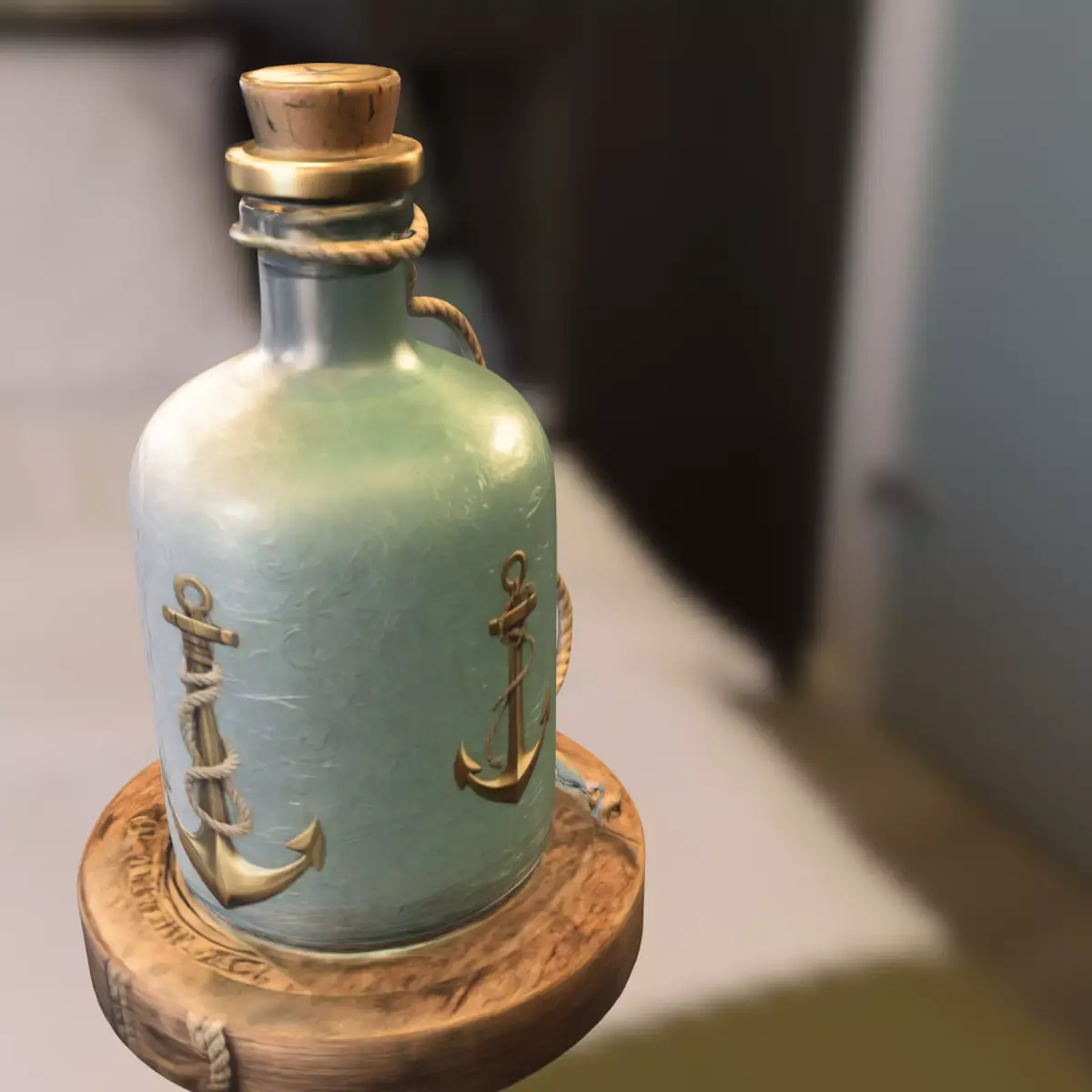 This high-quality 3D model showcases a nautical glass bottle featuring a detailed metal anchor emblem, rustic cork stopper, and a wooden base wrapped in realistic rope. Designed for use as a decorative or collectible item in maritime, pirate, or fantasy-themed games such as Sea of Thieves, Skull and Bones, Assassin’s Creed IV: Black Flag, Genshin Impact, or The Sims 4. Perfect for use in Unity, Unreal Engine, and Blender projects. This model is also optimized for 3D printing, making it suitable for physical props, themed decor, or dioramas.