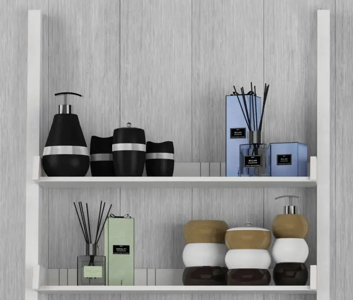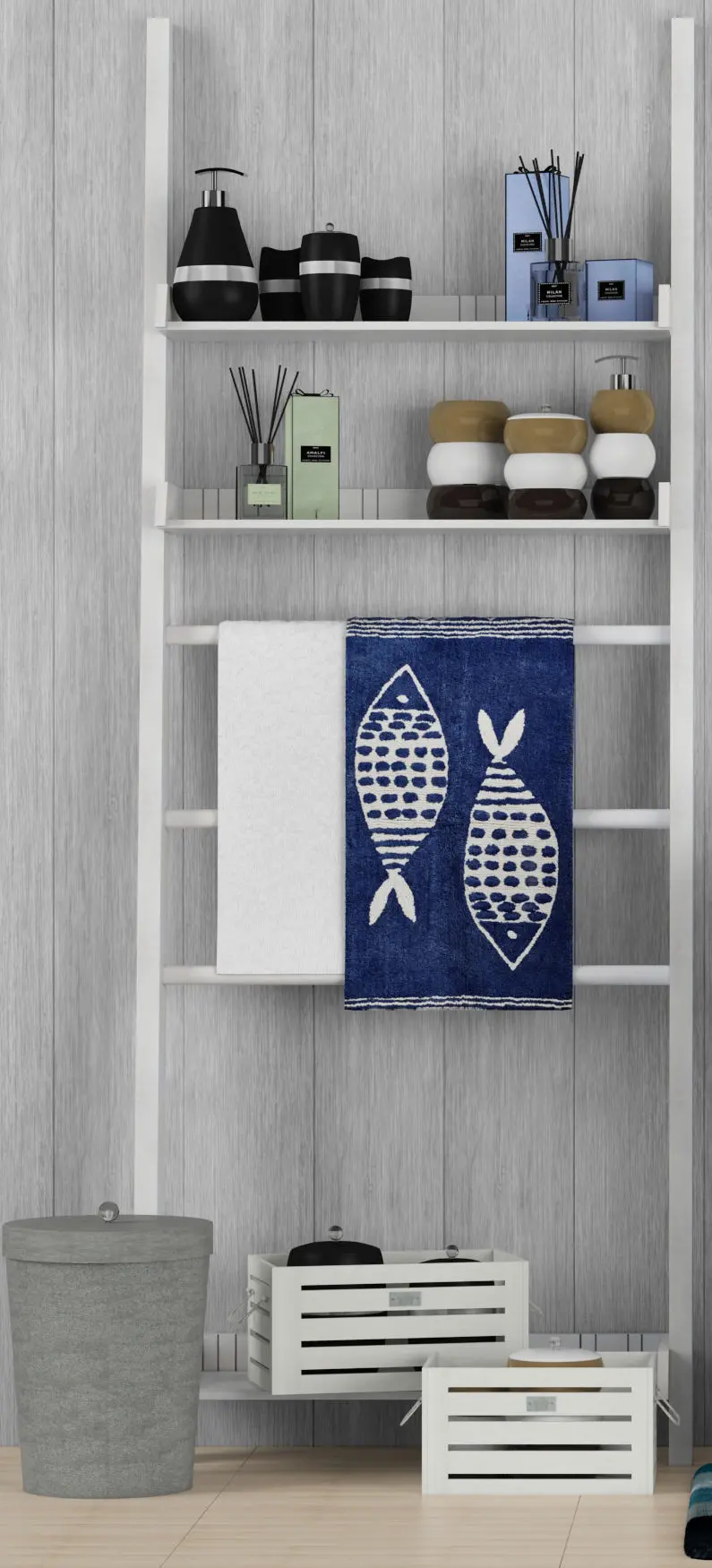 White Wood Leaning Ladder ShelfWhite Wooden Slat 4 Drawer UnitSet Of 4 Charcoal Glitter DrawersWhite Wood Mirror With HooksSet Of 2 Silver Glitter BoxesSet Of 4 Glitter Drawer UnitWhite Wood 2-In-1 ShelvesBathroom decor collectionSet air freshener (Next)Glitter Laundry BinBlue Fish TowelSet Of 2 CratesCarpet