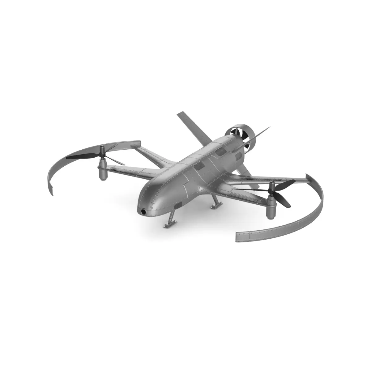 A sleek and futuristic naval drone with a metallic silver body and a streamlined shape, equipped with advanced sensors and communication systems for autonomous operation in current timeline.