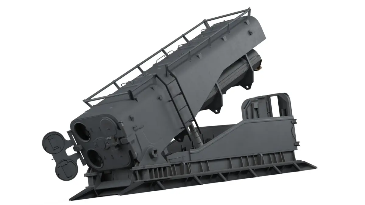 This highly detailed model features a robust structure with four missile tubes housed within a reinforced casing. The launcher includes intricate elements such as access hatches, stabilizing platforms, and realistic surface textures, offering an authentic representation of modern defense technology.