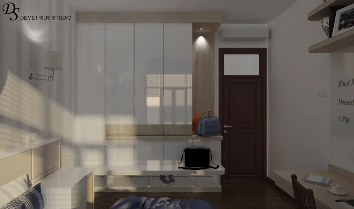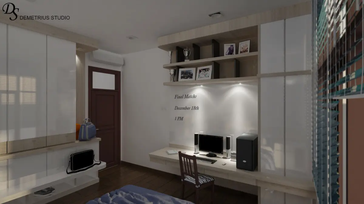 Ready to use bedroom scene in Navy, blue and white color complete set with bed, night table, closet and desk, the headboard are built in type