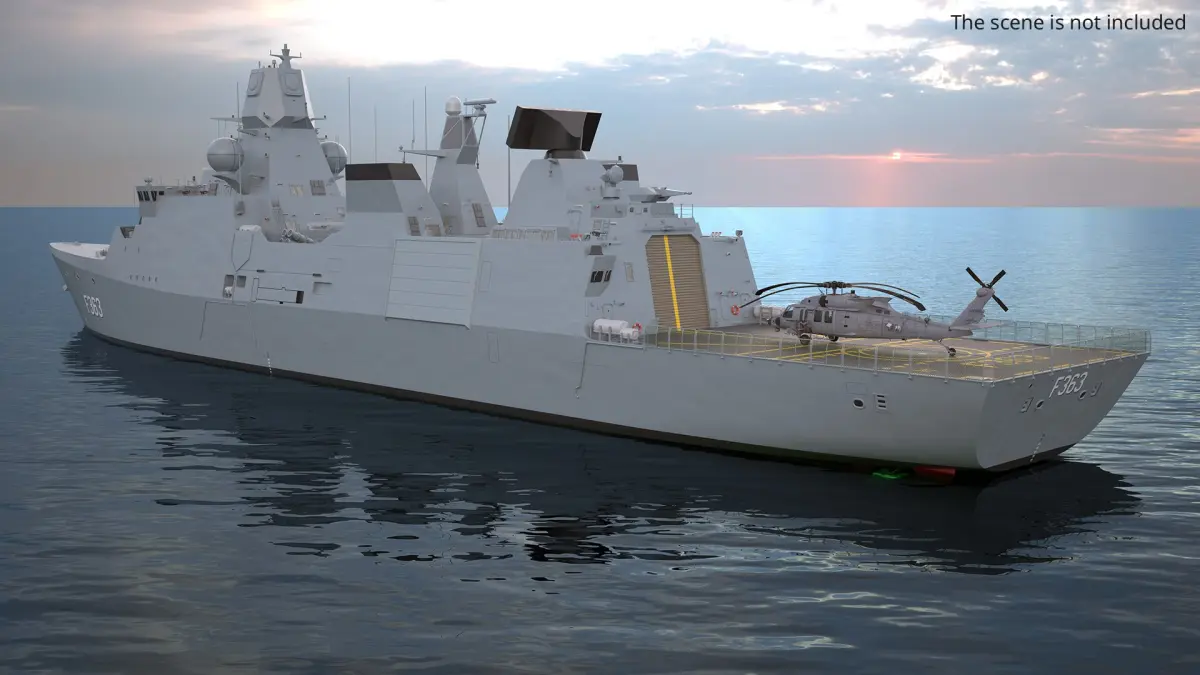 Navy Iver Huitfeldt Frigate with Helicopter Sikorsky HH-60 is a 3d model of a sophisticated naval warship, designed for modern maritime defense and warfare operations.