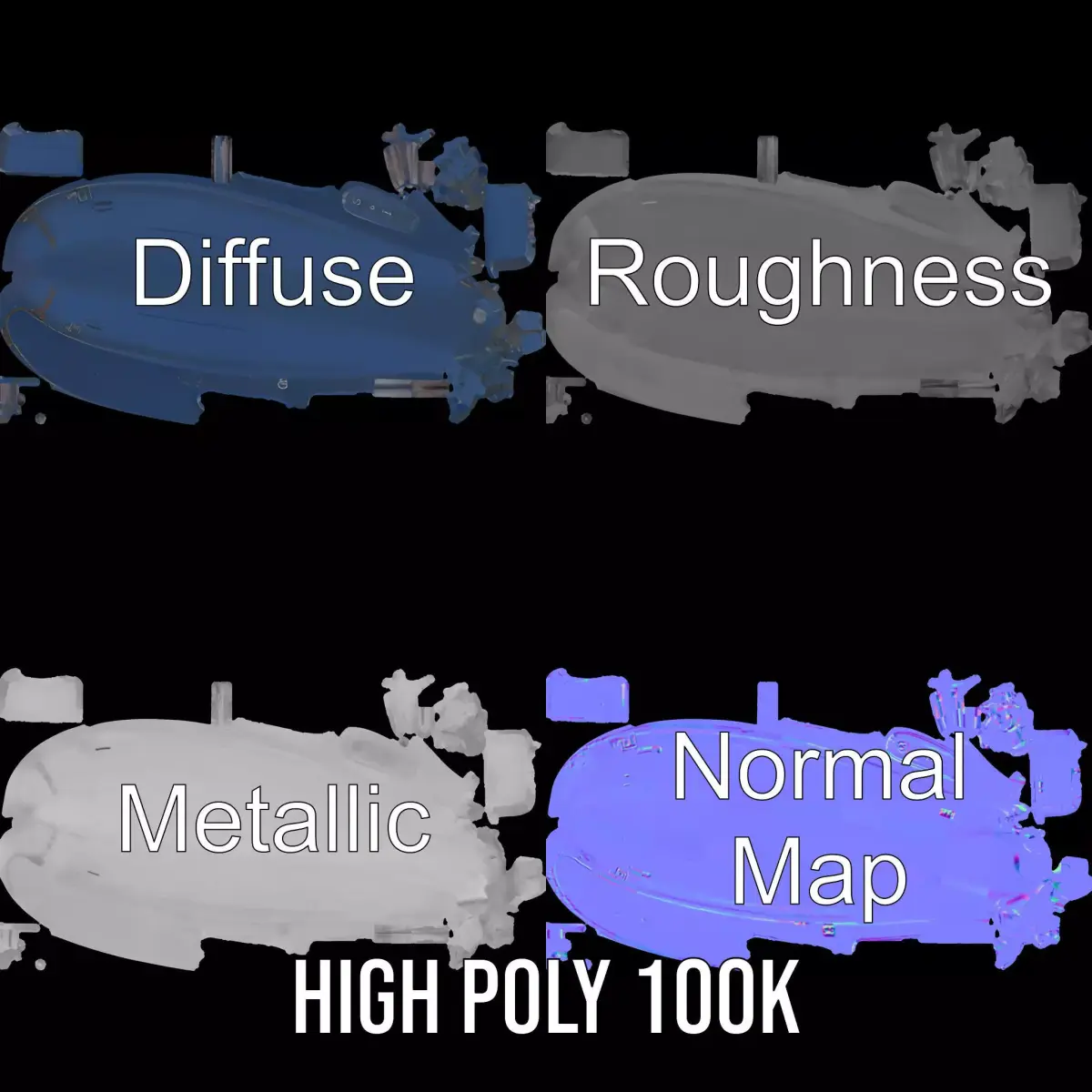 Introducing the Navy Submarine model pack - a highly detailed and versatile 3D model perfect for any navy or maritime simulation. Designed for diverse applications, this model fits perfectly in military simulations, educational displays, and strategic games. Each model has 3 levels of detail: low-poly (1000 triangles for mobile), middle-poly (10,000 triangles for environment), and high-poly (100,000 triangles), which allows for the use of this model in production rendering (such as 3ds Max, Maya, Cinema 4D, Blender, Vray/Corona/Cycles, and all others), game engines (Unity and Unreal compatible), and interactive presentations, providing a choice of detail based on the LOD System principle. The model's textures are PBR, Diffuse, NormalMap, and reflection/roughness/metallic, which are suitable for any modern rendering engine. All models are accurately unwrapped and have no overlapping UVs, with texture sizes at 4096x4096. Please like and leave a comment if you enjoyed this model.