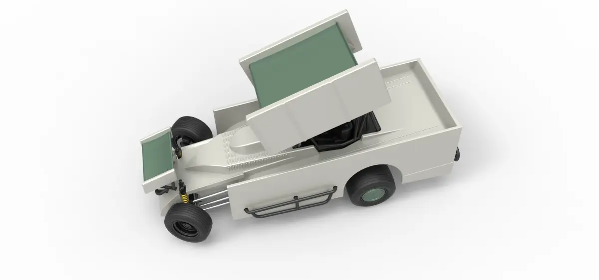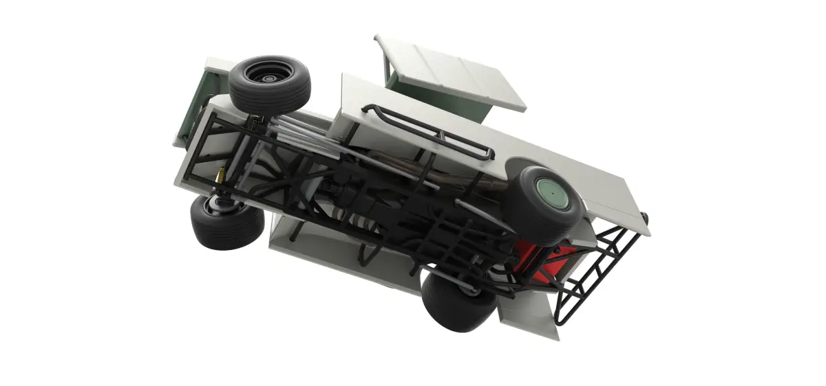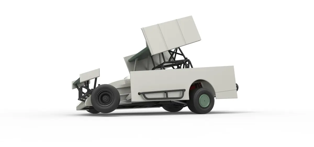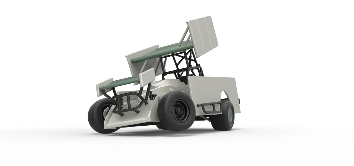 The model consists of parts: Air intake part 1-3, Body, Engine left part, Engine main part, Engine right part, Front bumper, Front left rim, Front left tire, Front right rim, Front right tire, Front wing, Left exhaust pipes, Left exhaust tube, Radiator, Rear left tire, Rear right tire, Rear rims, Right exhaust pipes, Right exhaust tube, Rim covers, Seat part 1,2, Shell left part, Shell main part, Shell right part, Shifter, Steering wheel, Tank, Top wing.