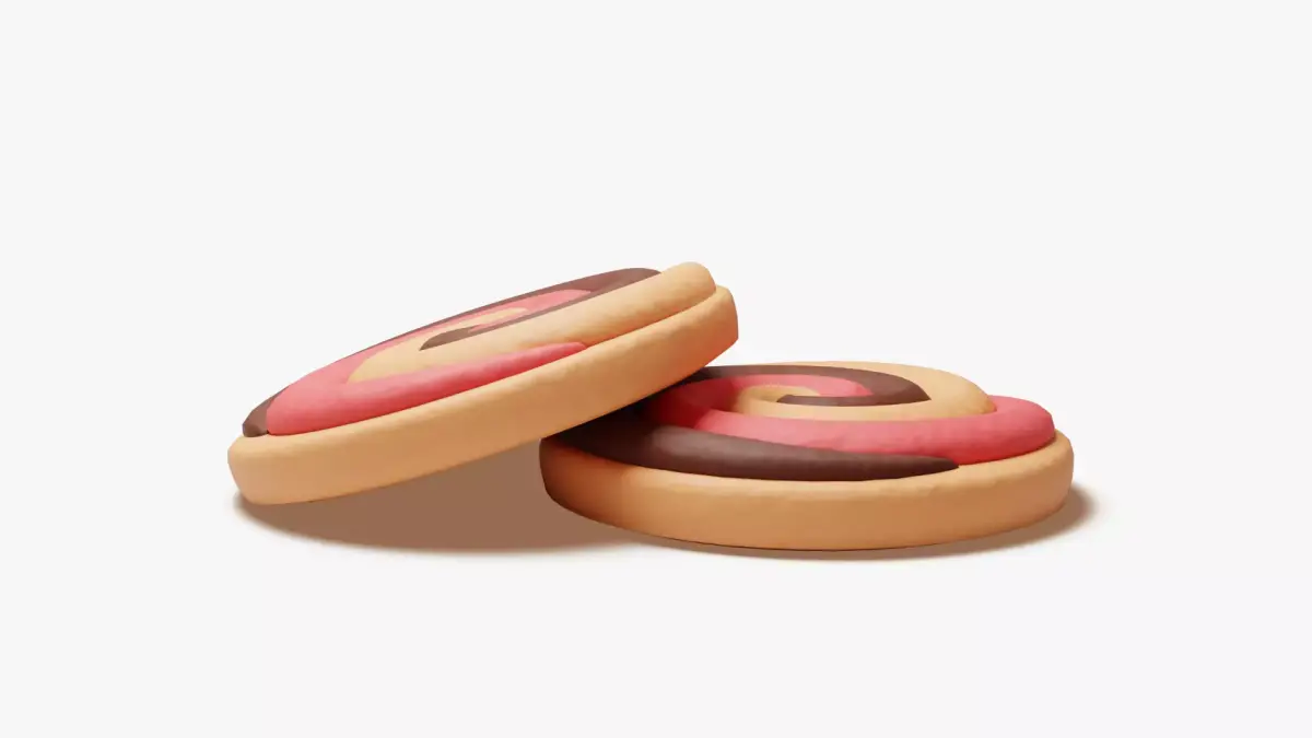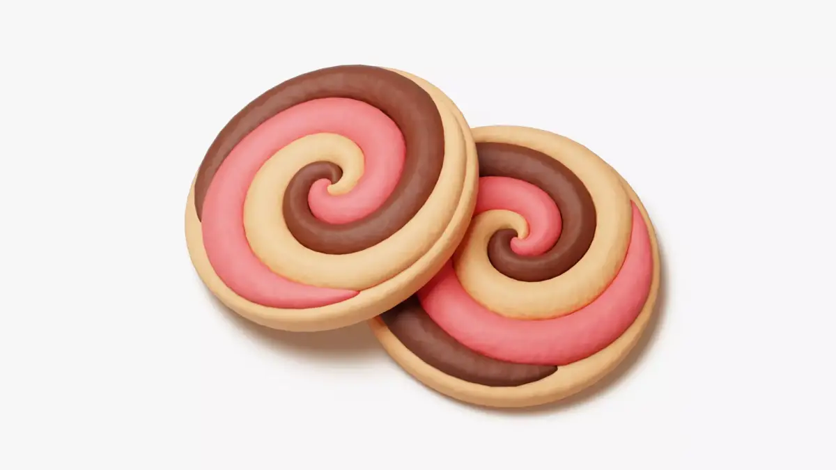A stylized round cookie with a three-color swirl that blends chocolate brown, strawberry pink, and vanilla cream tones. The spiral bands are thick and even, curling to a tidy center that reads clearly in closeups and thumbnails. Soft edges, subtle crumb texture, and gentle highlights give the biscuit a fresh, buttery look, while the high-contrast palette delivers instant “Neapolitan” recognition without relying on any brand cues.