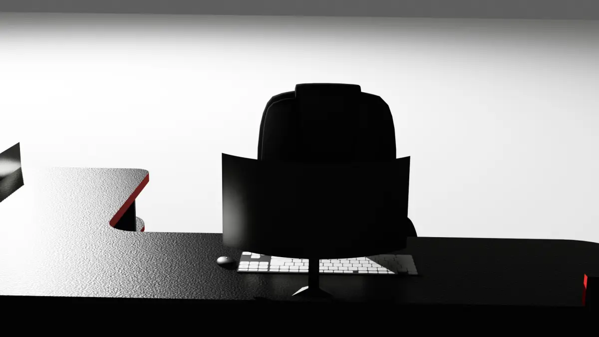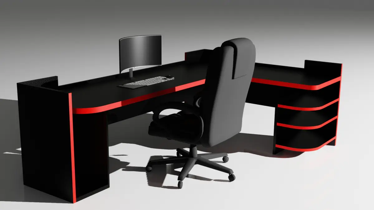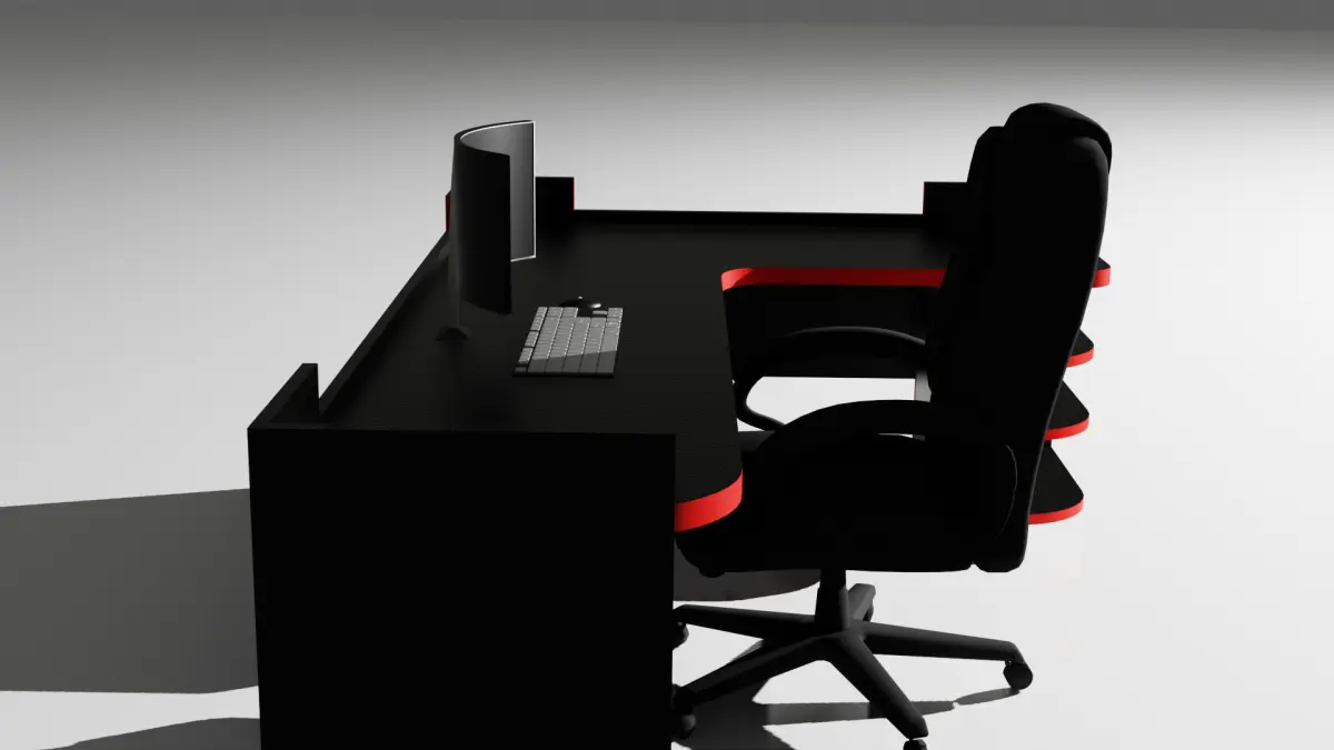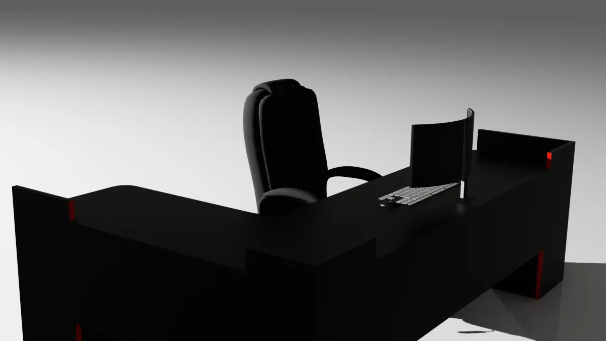 The image features a modern and sleek computer workstation setup rendered in 3D. A large, black, U-shaped desk dominates the scene with a matte, slightly textured surface and minimalist design. A high-back ergonomic office chair is positioned behind the desk, facing a curved widescreen monitor. On the desk in front of the monitor are a compact keyboard and a mouse. The lighting is soft, casting smooth shadows, and the background fades into a gradient of light gray, enhancing the futuristic and professional look. Subtle red accents can be seen embedded into the desk’s structure, adding a hint of style and sophistication.
