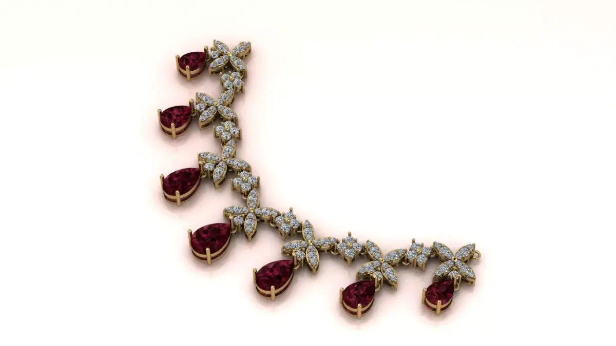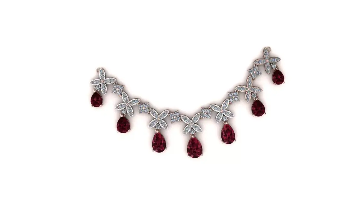 A radiant centerpiece necklace where shimmering floral motifs meet teardrop gems of your choice. Each blossom sparkles with brilliance, while the drops add a graceful flow, symbolizing elegance in every movement. Designed to adapt to any gemstone, this necklace transforms into a timeless treasure for every style and occasion.