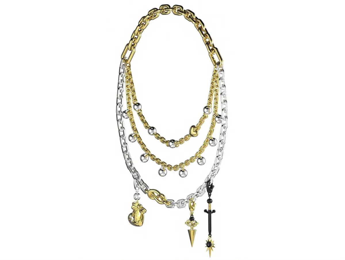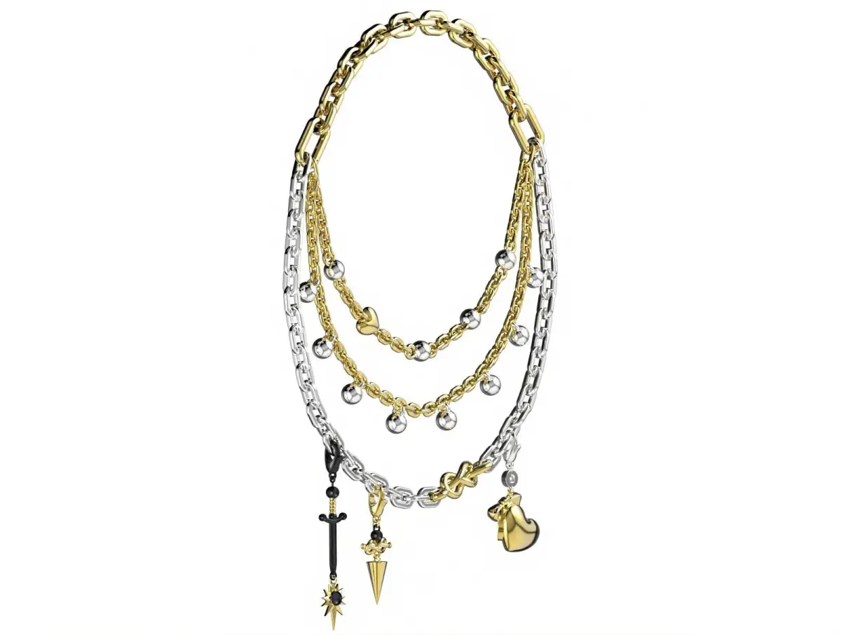 The necklace consists of 3 types of chain, 4 pendants, 2 connecting elements, and 2 carabiners. 3 pendants have their own carabiner and can be hung anywhere on the chain.