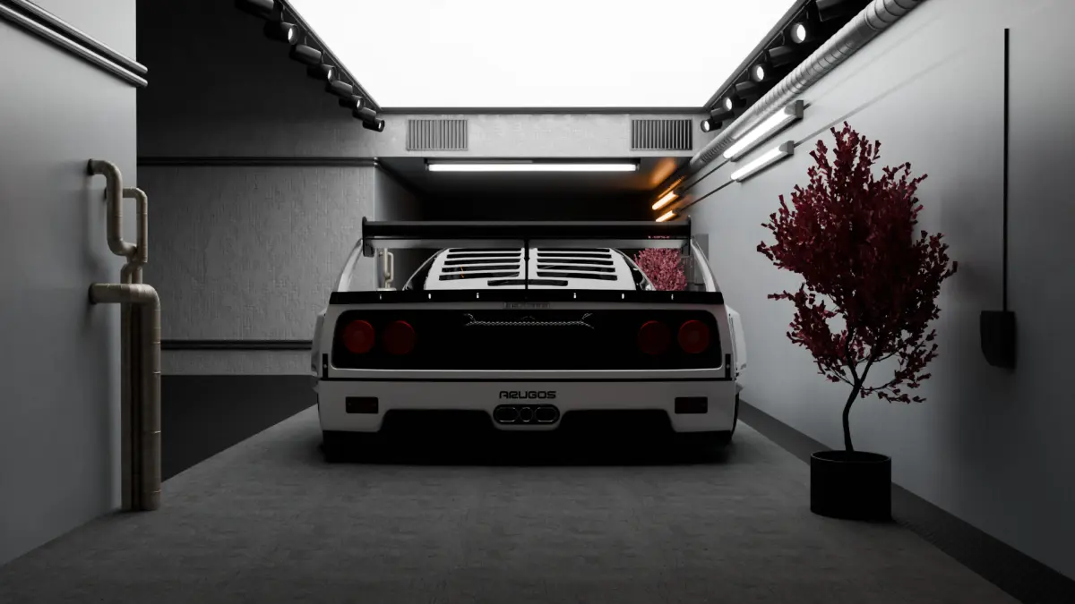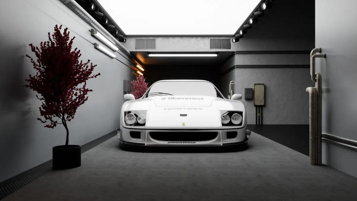The centerpiece, a custom Ferrari F40 race car, is set against a modern concrete structure, accented by vibrant cherry blossom plants and industrial lighting. All textures and materials are either procedural or sourced from the Blender Asset Library, with additional detailing using Blender Kit.