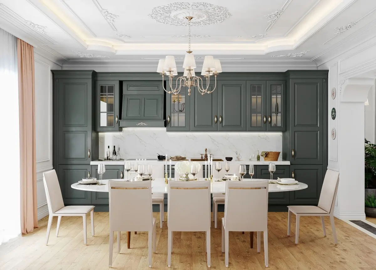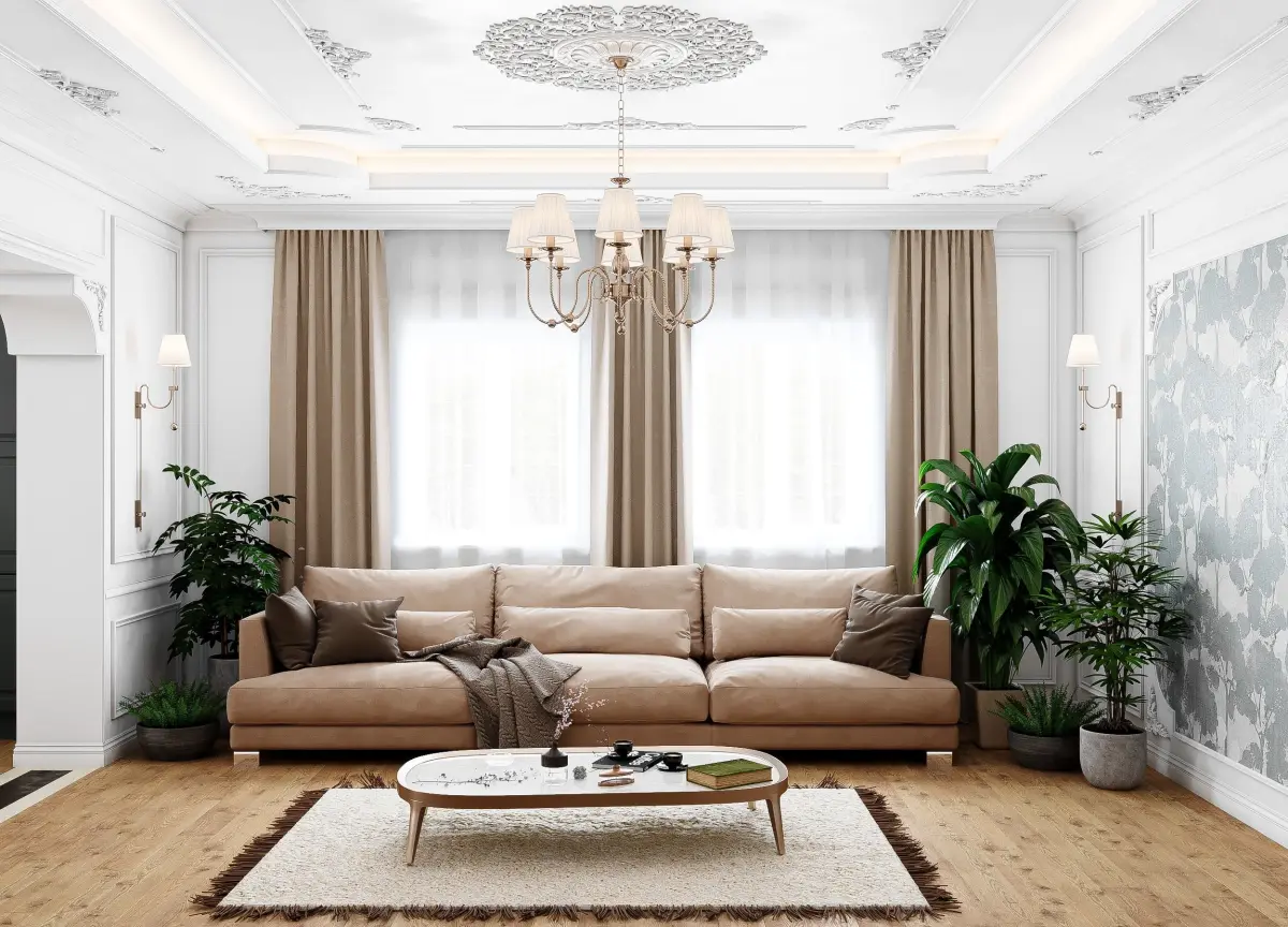 The scene includes a neoclassical living and kitchen room model in a modern style. All patterns and textures are included. Materials and light sources are customized for corona render. In the final 3 PSD files you can see the post-production process with adjustment layers. The scene includes high qualty textures and models.