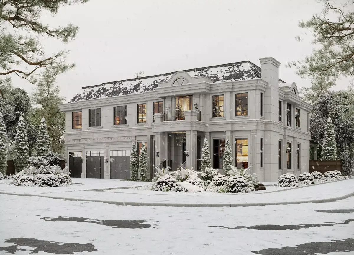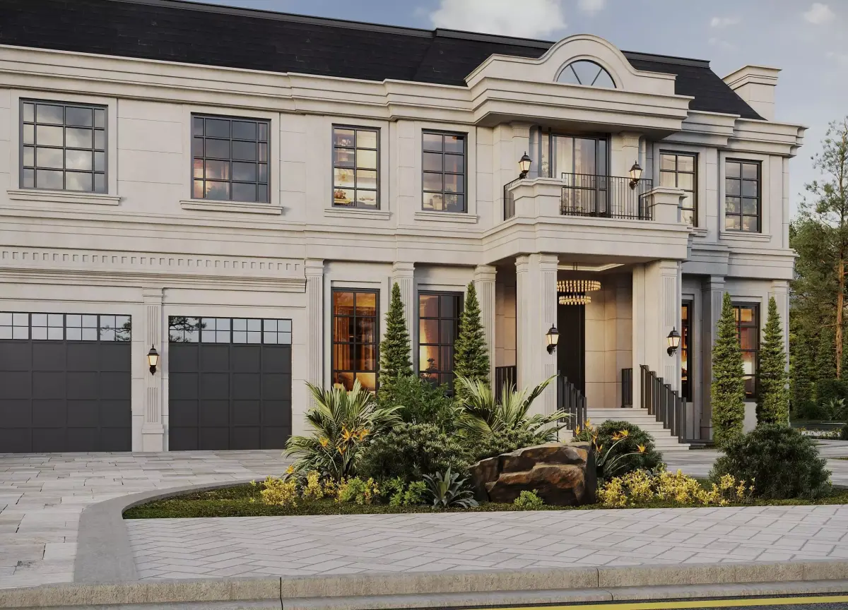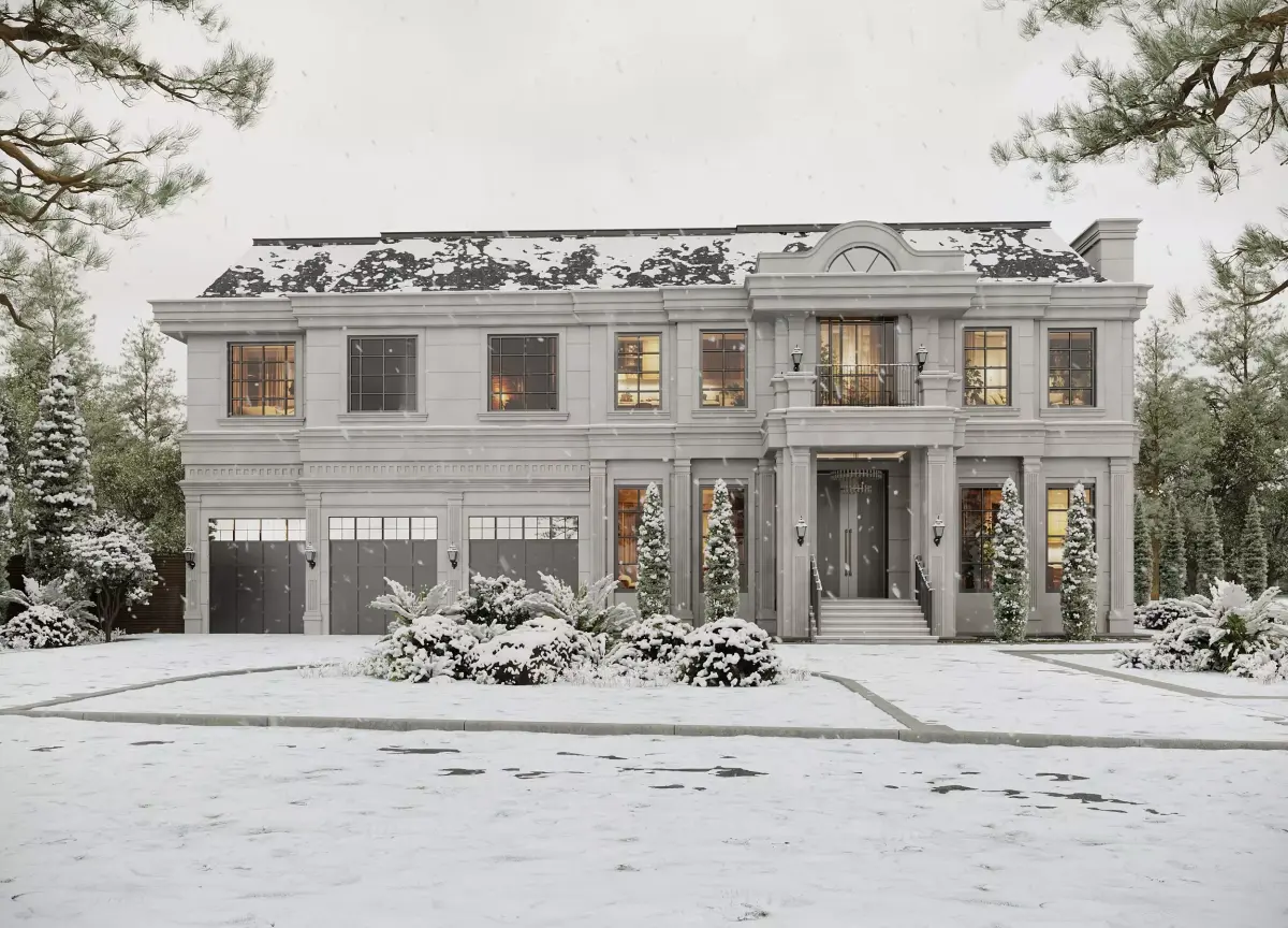 This product includes a fully prepared exterior scene of a luxury neoclassical villa presented in a summer setting.