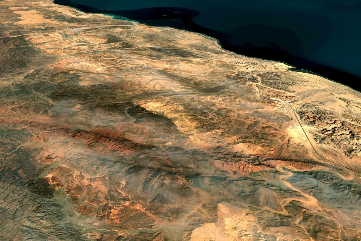 Terrain model of a region in Suadi Arabia, where project NEOM LINE is under development. THE LINE, a revolution in urban living at NEOM, and a blueprint for how people and planet can co-exist in harmony.