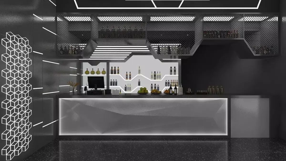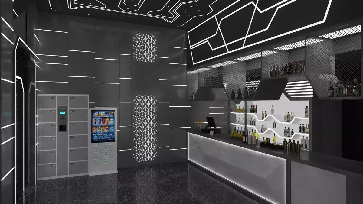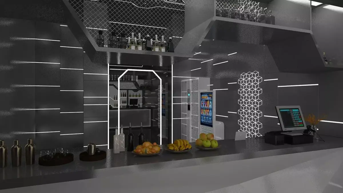 Interior scene of a sci-fi bar with bathroom.