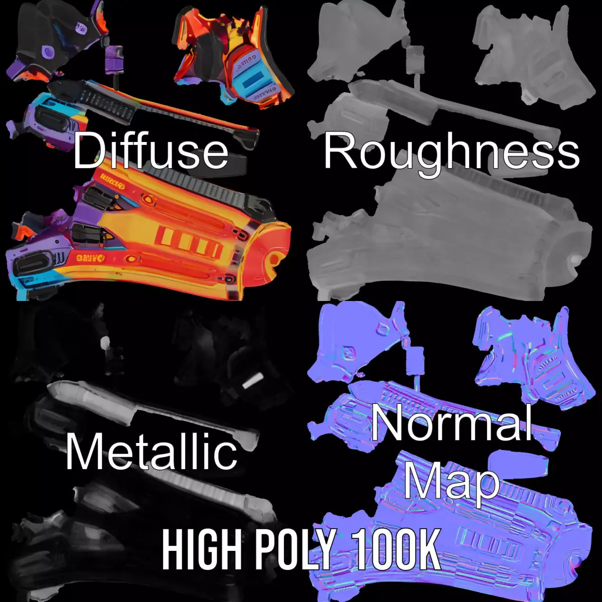 The Neon Blaster model pack features a highly detailed, vibrant shotgun design that stands out with its futuristic neon color scheme. Each model has 3 levels of detail: low-poly (1000 triangles for mobile), middle-poly (10,000 triangles for environment), and high-poly (100,000 triangles), which allows for the use of this model in production rendering (such as 3ds Max, Maya, Cinema 4D, Blender, Vray/Corona/Cycles and all others), game engines (Unity and Unreal compatible), and interactive presentations, providing a choice of detail based on the LOD System principle. Perfect for sci-fi video games, VR experiences, and film projects requiring high-tech weaponry. The model's textures are PBR, Diffuse, NormalMap, and reflection/roughness/metallic, which are suitable for any modern rendering engine. All models accurately unwrapped and have no overlapping UV. All textures are 4096*4096 in size. Please like and leave a comment if you enjoyed this model!