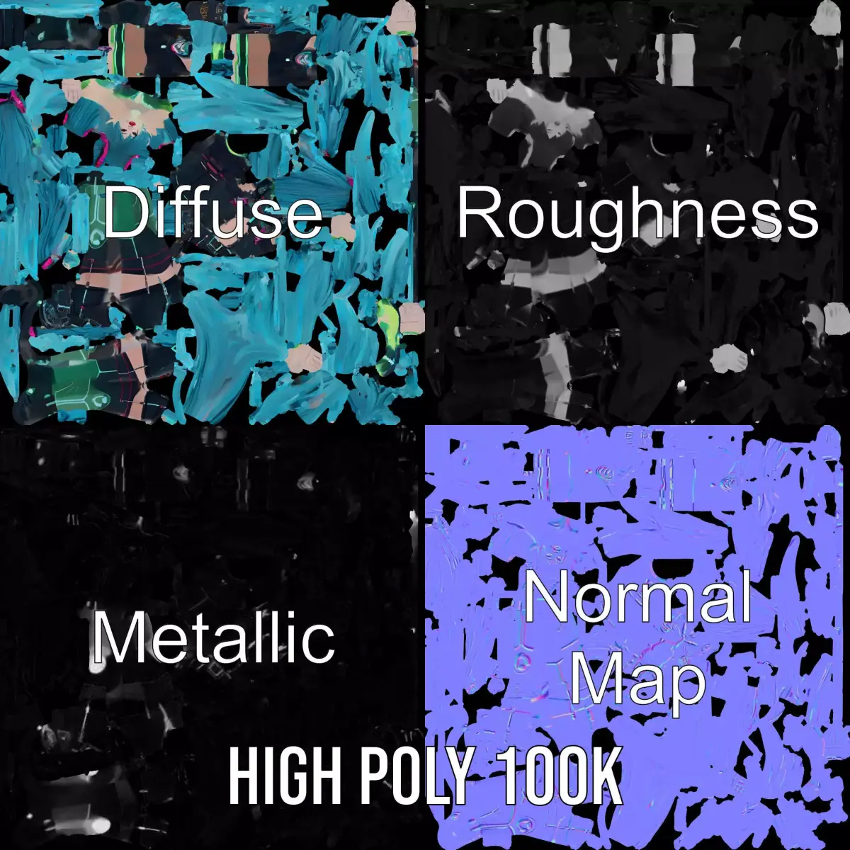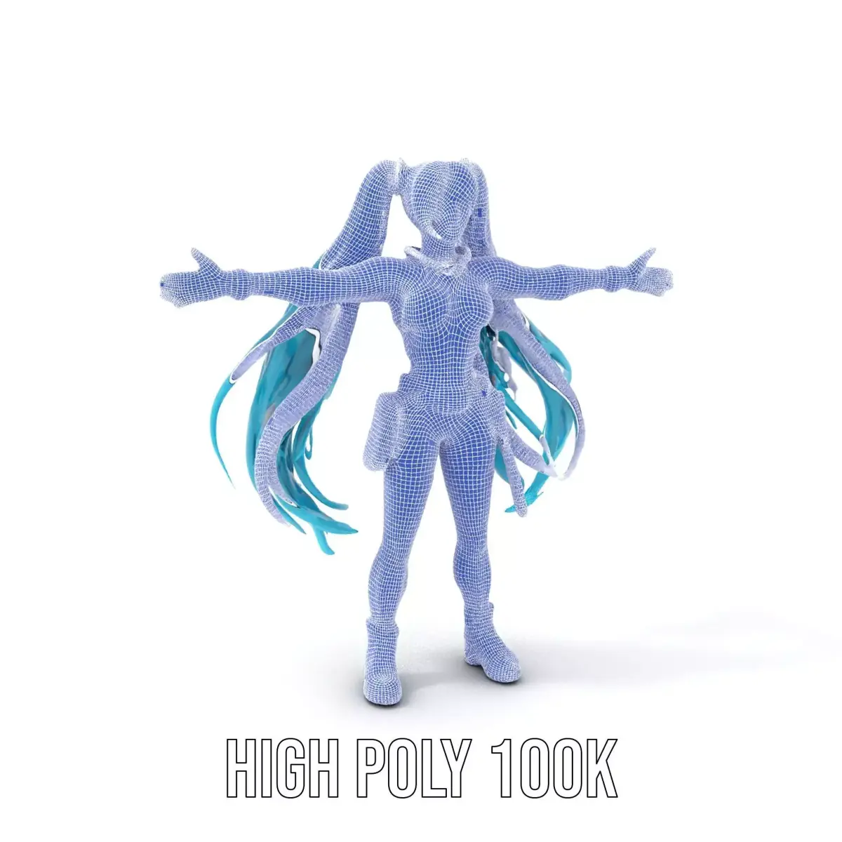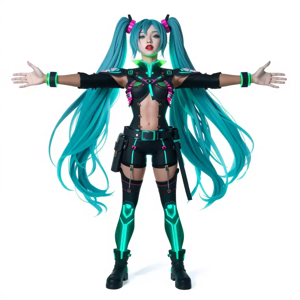 This 3D model features a vibrant neon cyberpunk character with long turquoise hair and futuristic attire, ideal for sci-fi and fantasy games. Each model has 3 levels of detail: low-poly(1000 triangles for mobile), middle-poly(10 000 triangles for environment), and high-poly(100 000 triangles), which allows for the use of this model in production rendering(such as 3ds max, Maya, Cinema4d, Blender, Vray/Corona/Cycles and all other), game engines(Unity and Unreal compatible), and interactive presentations, providing a choice of detail based on the LOD System principle. Perfect for game developers and visual artists to bring futuristic environments to life. The model's textures are PBR, Diffuse, NormalMap, and reflection/roughness/metallic, suitable for any modern rendering engine. All models accurately unwrapped and have no overlapping UV. All textures are 4096*4096 in size. If you enjoyed this model, please like and leave a comment.