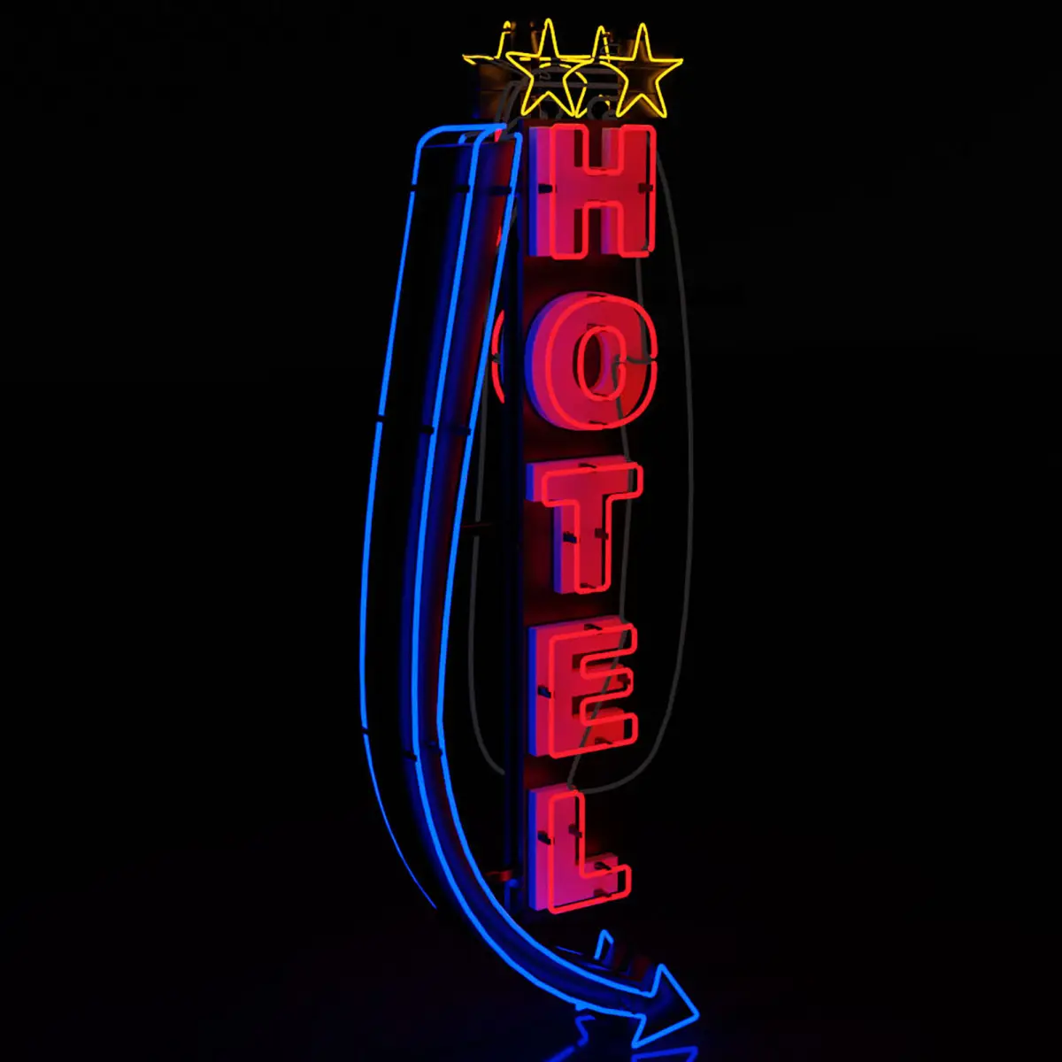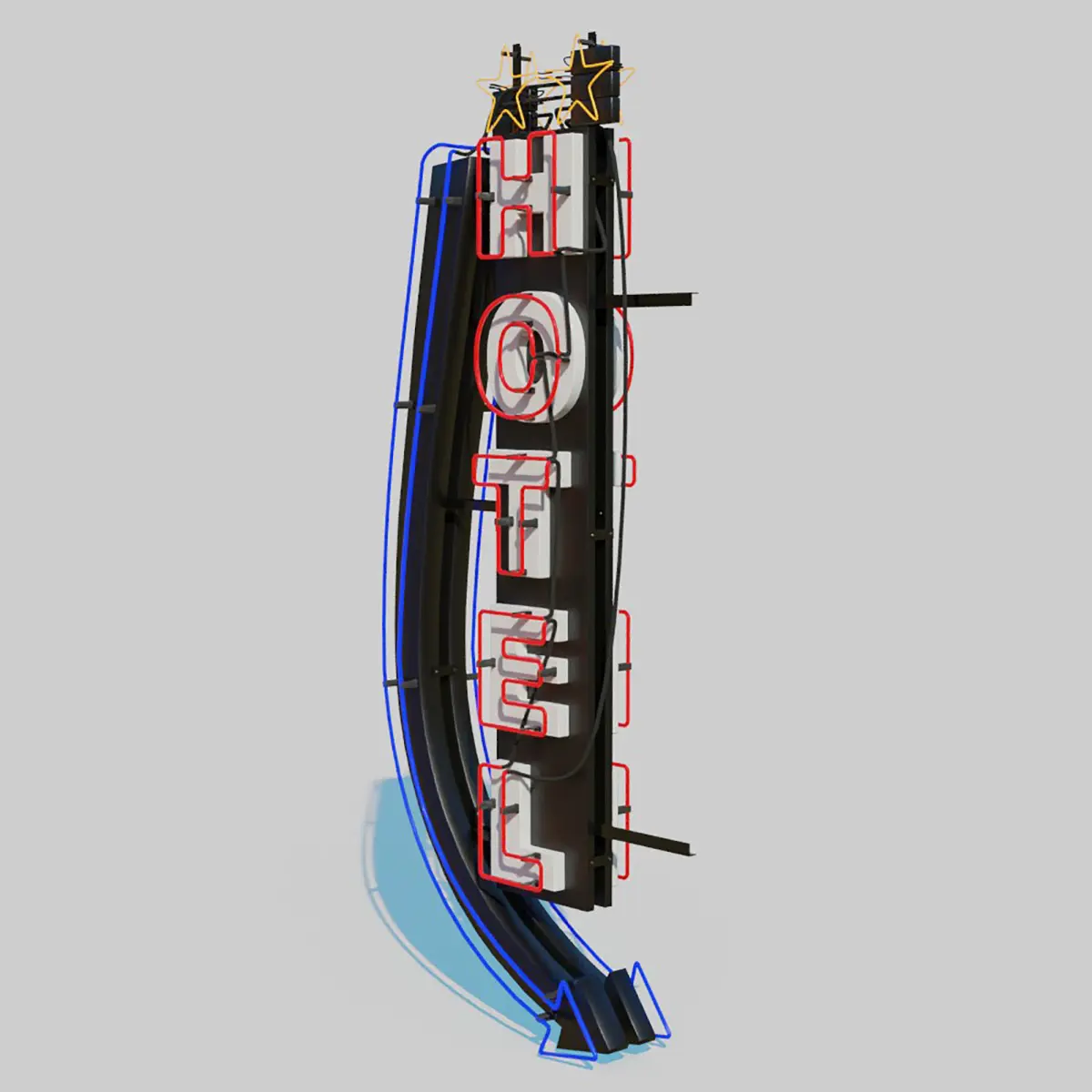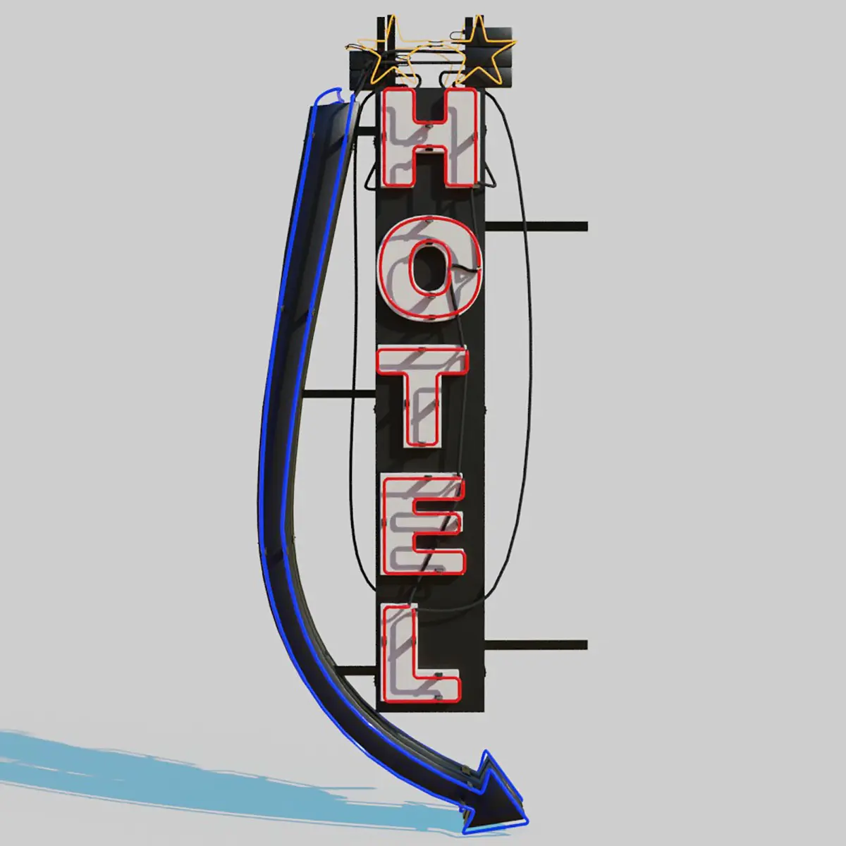 Looking to add some eye-catching detail to your scenes? Look no further than our latest release - the Neon Hotel Sign! Standing at a true-to-life height of 149cm x 48cm x 447cm, this striking model is the perfect addition to any project. With 162,252 polygons, every detail is expertly crafted for maximum impact. The included file formats (.blend, .fbx, .obj, .gltf, and .dae) give you the flexibility to work with the software of your choice. And, with the Blender file ready to render using Cycles and Eevee and a set of 4K .png maps (base color, roughness, normal, metallic, emission), you'll have everything you need to create a stunningly realistic scene. Illuminate your vision and take your project to the next level with our Neon Hotel Sign.