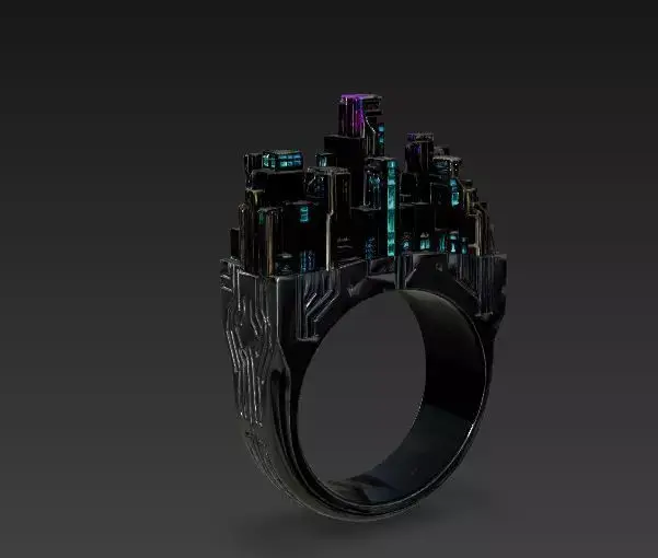 The Overall Concept This isn't a traditional piece of jewelry; it is a wearable piece of architecture. Instead of holding a gemstone, this ring features a miniature, high-tech city skyline sitting on top of the finger. It fits perfectly into a cyberpunk setting or a sci-fi inventory.