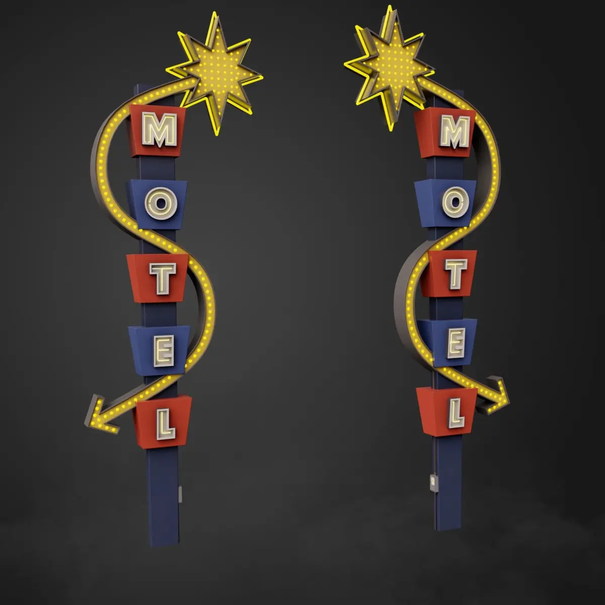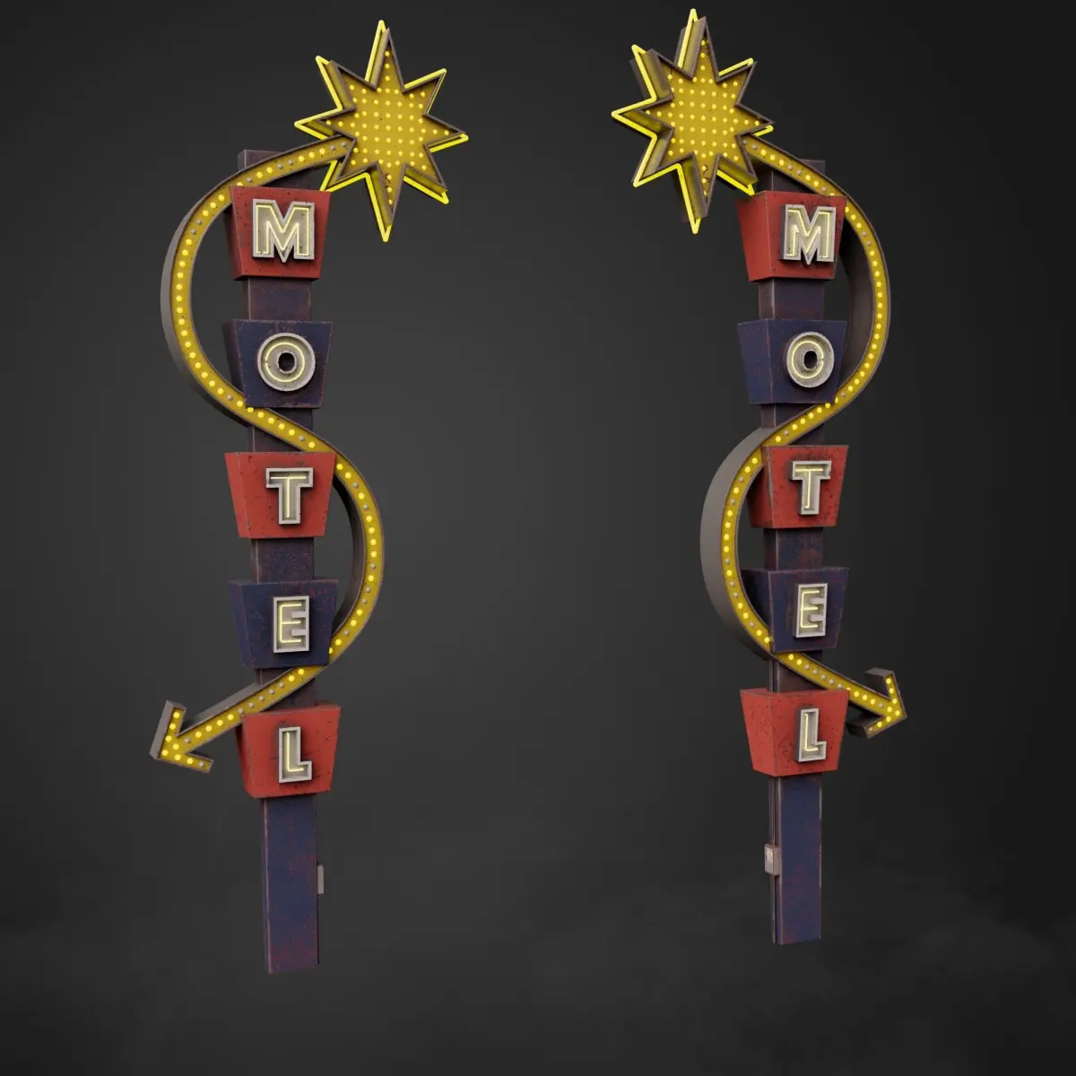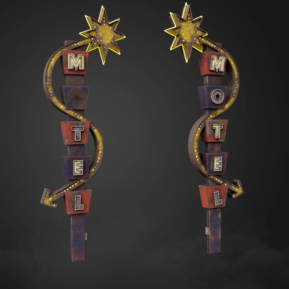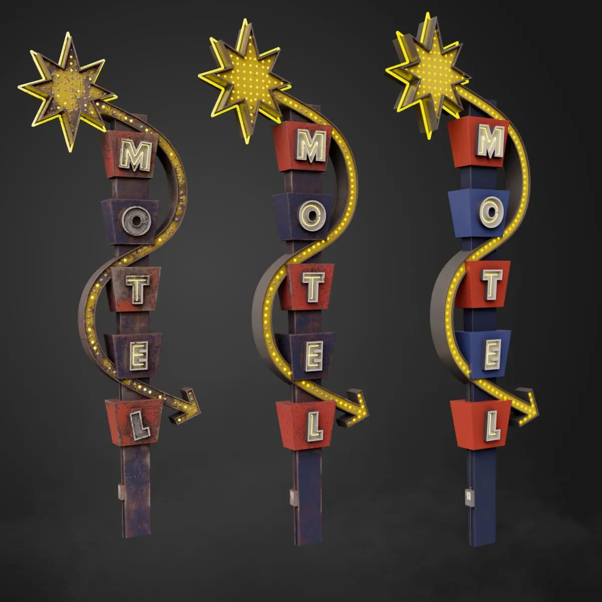 Neon sign Motel in the style of 60-80 years made in 3 states: whole, rusty and old. This model has a low-poly grid.This model contains 3 packs of PBR textures (1 pack of textures for each state).
