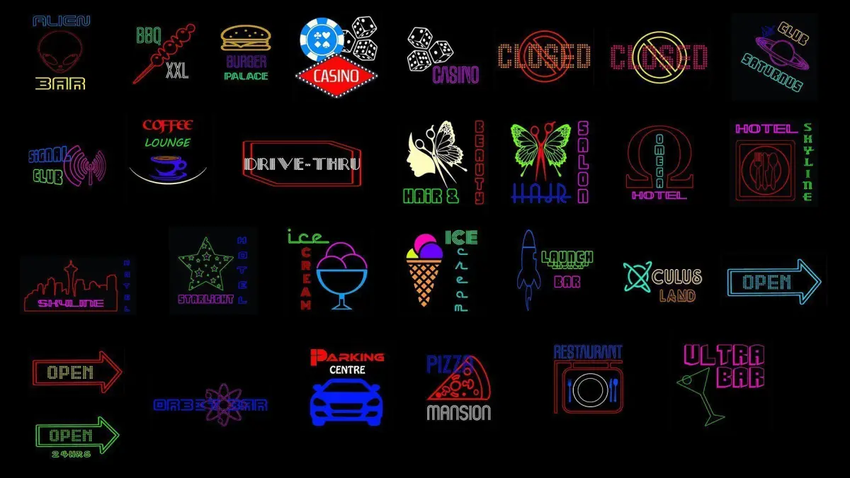 Collection of 120 neon signs (blueprints), including all kind of signs, such as: hotels, restaurants, bars, open and closed signs, fast food and others.