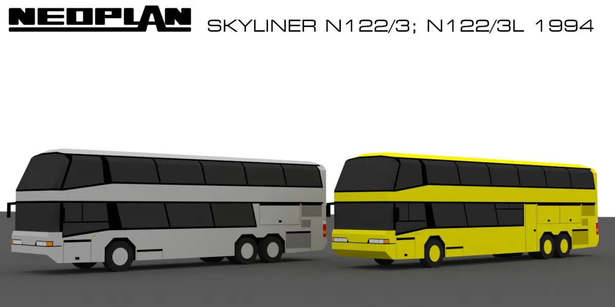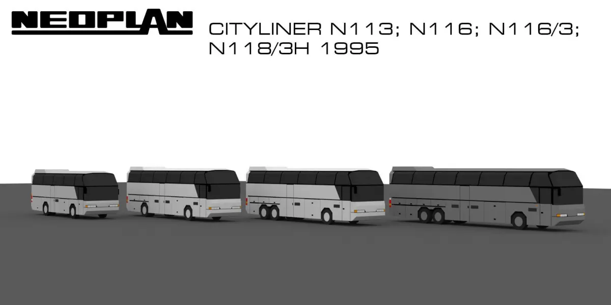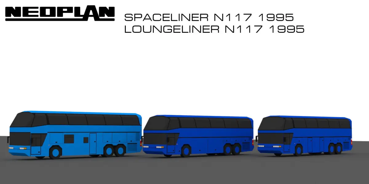 The pack contains 11 real-size, low-poly buses (Were used only standard materials):Neoplan Megaliner N128/4 1994 - 844 polygons;Neoplan Skyliner N122/3L 1995 - 780 polygons;Neoplan Skyliner N122/3 1995 - 746 polygons;Neoplan Cityliner N118/3H 1995 - 769 polygons;Neoplan Cityliner N116/3H 1995 - 742 polygons;Neoplan Cityliner N116 1995 - 661 polygons;Neoplan Cityliner N113 1995 - 605 polygons;Neoplan Spaceliner N117/3 1995 - 780/781 polygons;Neoplan Loungeliner N117/3 1995 - 786 polygons;Neoplan Jetliner N216 1995 - 611 polygons;Total amount of polygons - 8105;