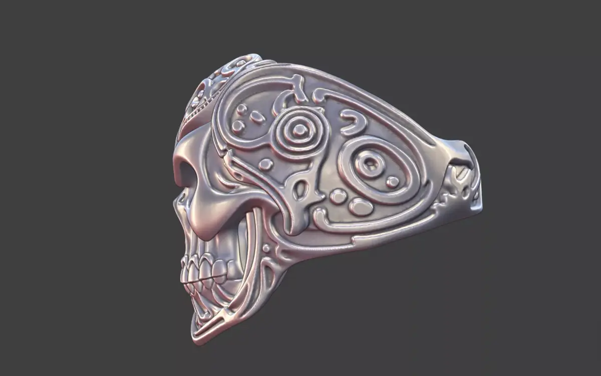 The NeoRelic Skull Ring merges ancient symbolism with futuristic aesthetics, creating a bold hybrid piece ideal for advanced sterling silver jewelry production. The skull is sculpted with clean, angular contours, contrasted by intricate techno-patterns carved directly into the surface. These patterns resemble mechanical glyphs, and fragmented geometric lines, giving the ring a distinctly sci-fi identity while still honoring traditional skull iconography.