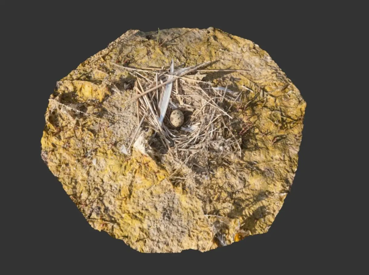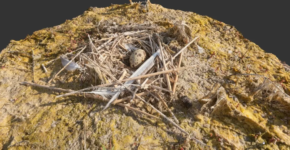 3D scanned bird nest with an egg ready to hatch. Located next to a seaside, with seaweed and other grass around. The bird flew away for a while and i was able to capture scanning data. Acquired in a black sea region, next to city of Odessa.