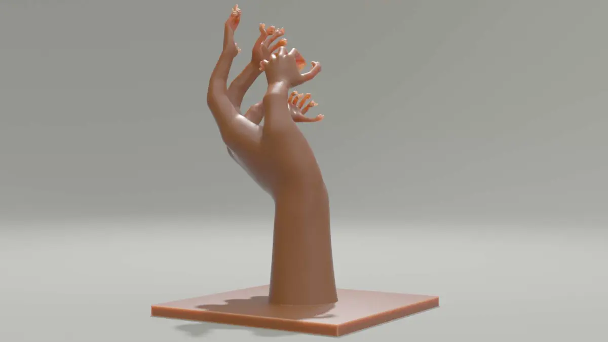A hand, the fingertips of which take the form of a hand which has a hand at the end of their finger.Decration object, perfect for 3D printing. The original and textured c4d scene is offered, as well as the OBJ, FBX, STL and DAE versions.