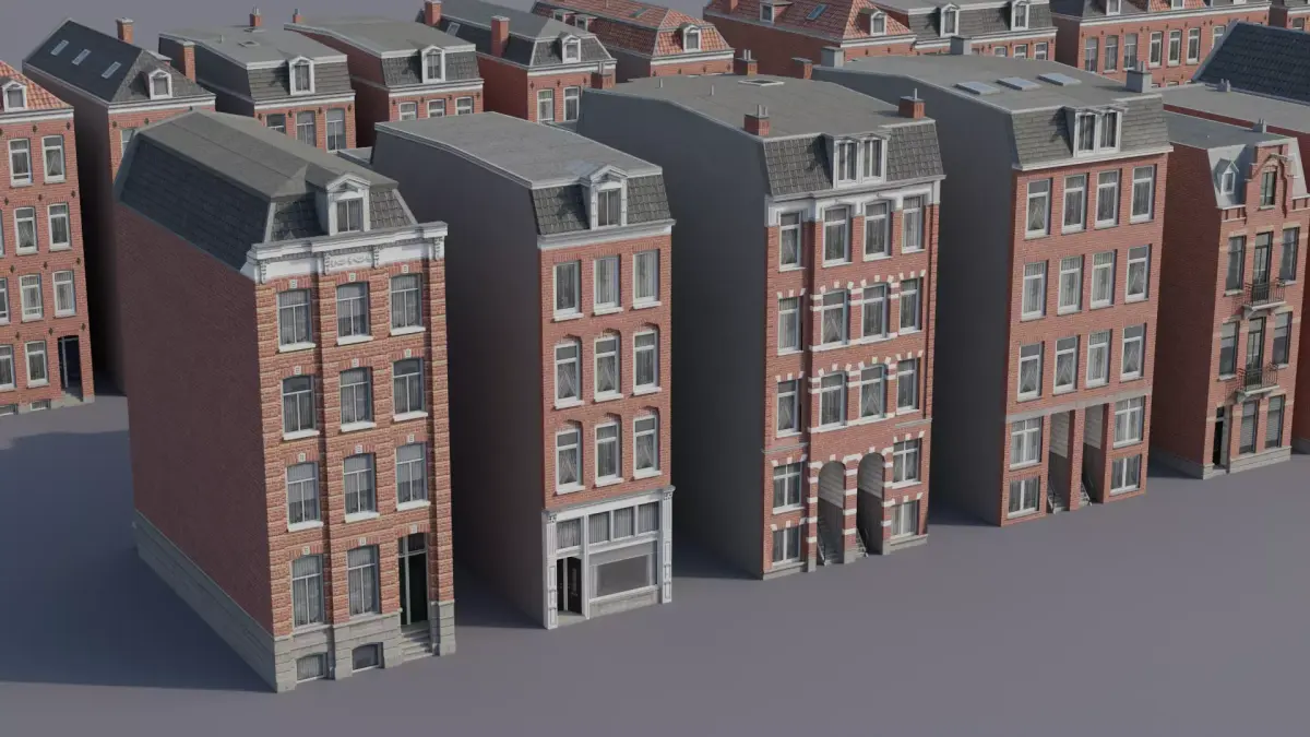 Detailed Recreation of the Amsterdam Revolutiebouw. Large city areas from the late industrial revolution are covered in these buildings.