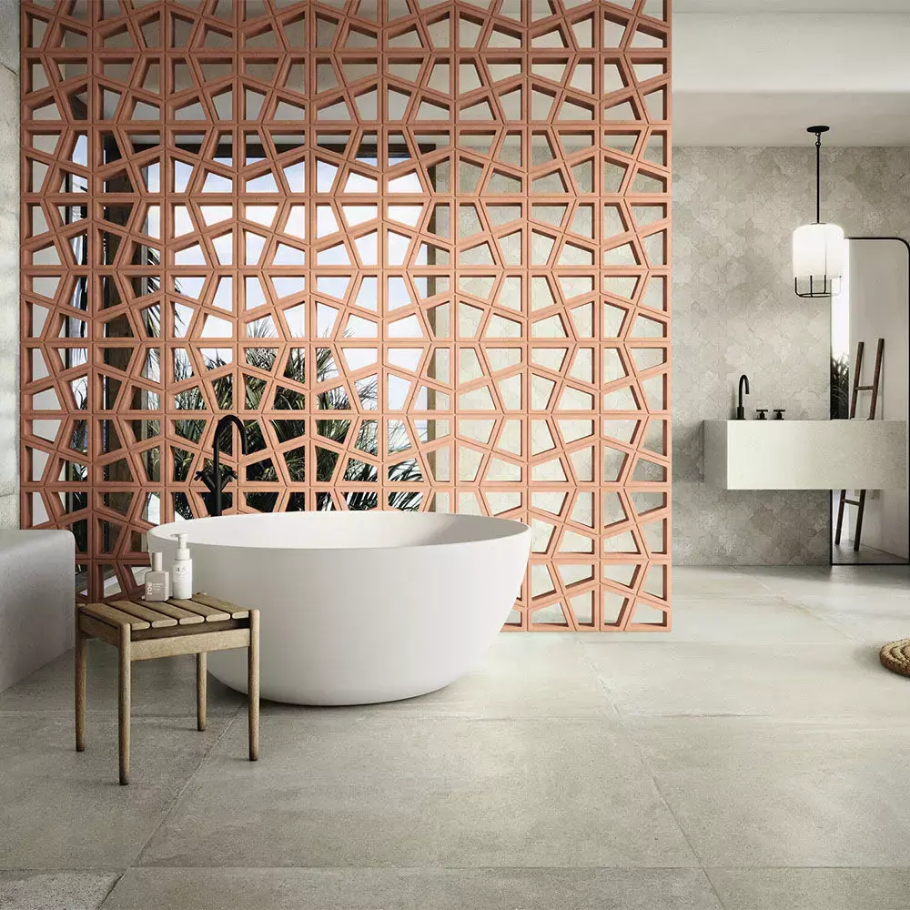Realistic beige ceramic tile finish, blending seamlessly into a wide variety of interiors—bathrooms, kitchens, living rooms, and commercial spaces.