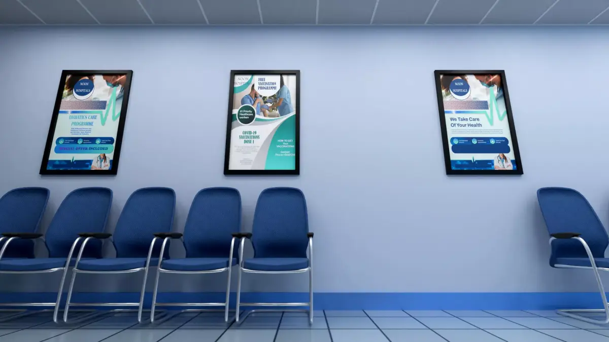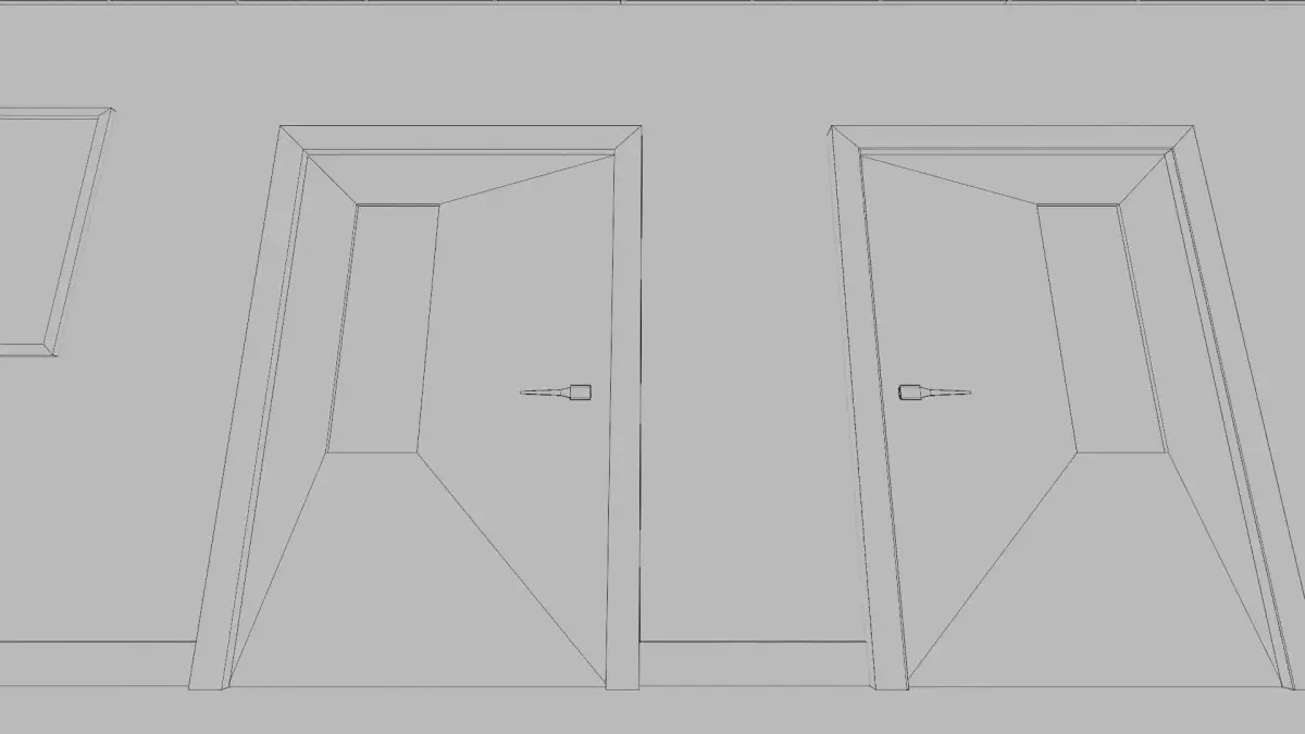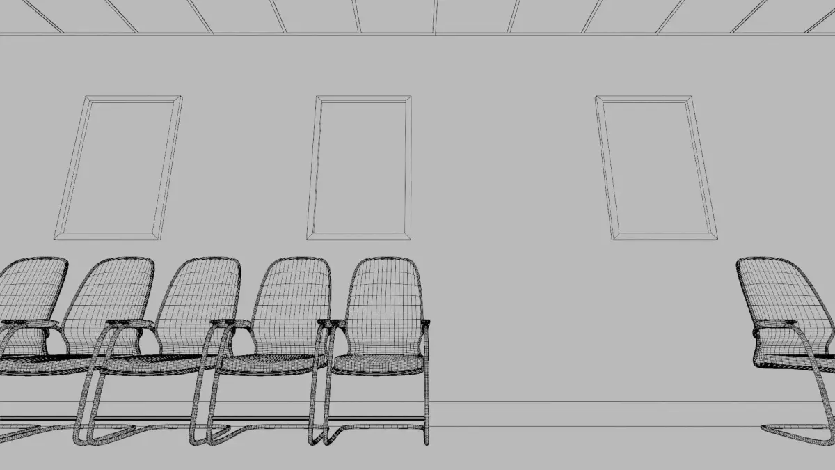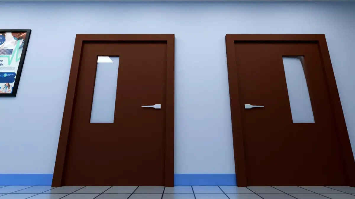 - Simple Layout: Simple Layout Including Doctors visiting room doors, signage posters, Floor skids, ceiling-mounted lighting, and Ceiling panels.