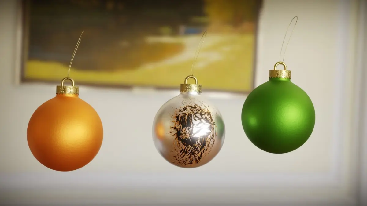 So. There are 2 types of Christmas balls, one with a print and one with a paint splash effect. There are textures of color for each element. Also made 2 materials, Tiger. One orange, the other black. Black for metallic. To make the tiger itself matte and the ball is metallic, connect the black tiger to color_ramp and then plug it in metallic and that's it.