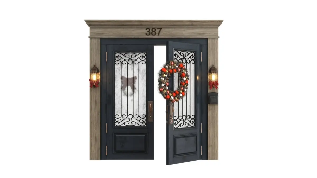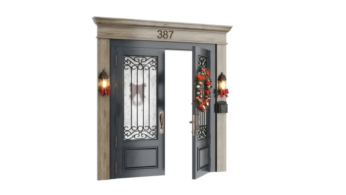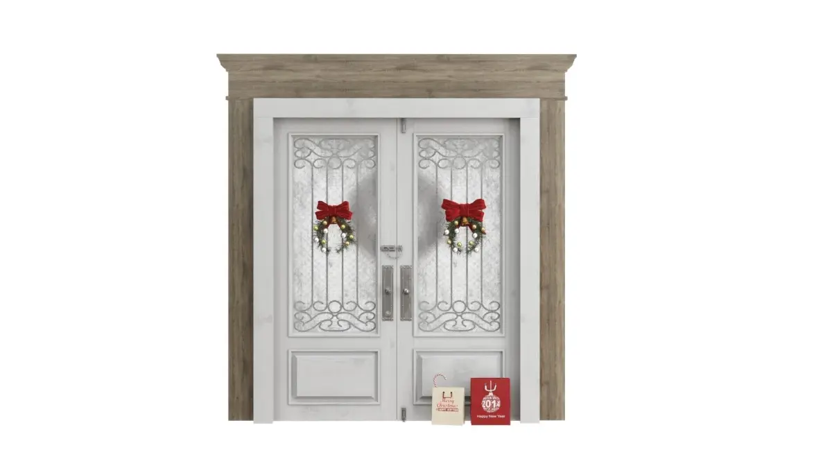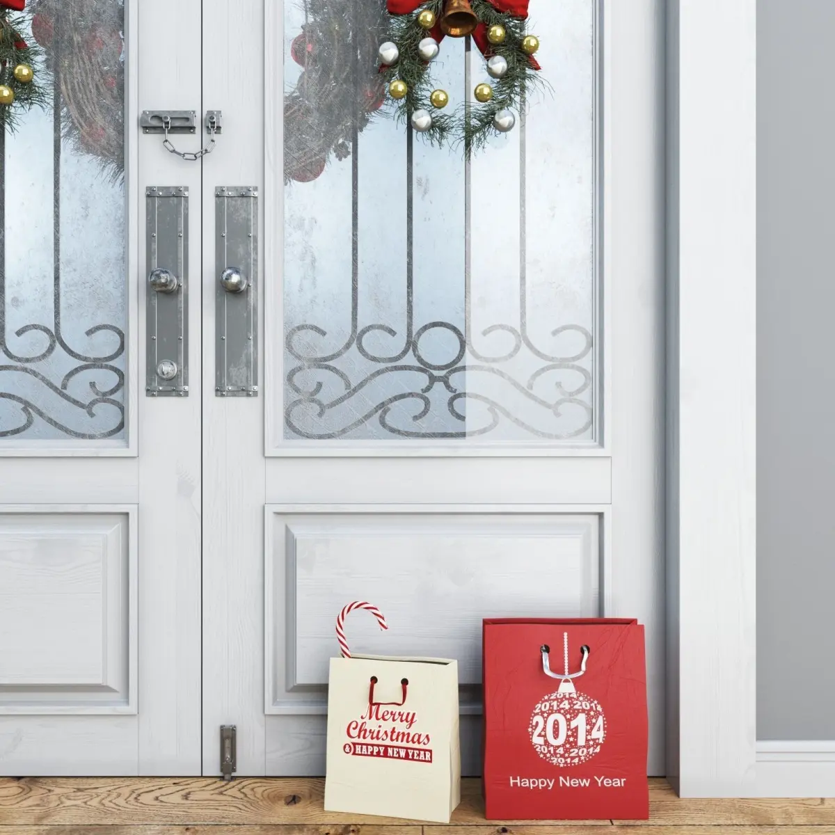 -door-packages-christmas wreath-bra-lamp-сhristmas decoration-doors-bells-bow-Christmas toys-Christmas balls-cones-stained glass-entrance door