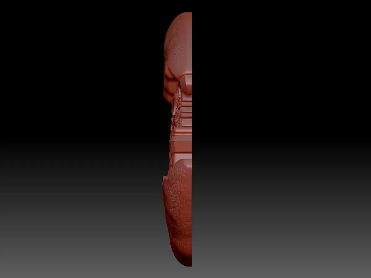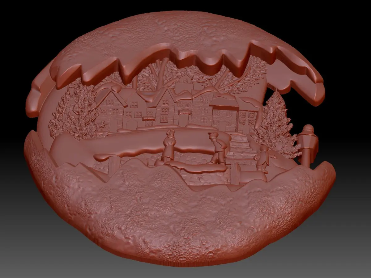 A 3D model of a bas-relief of a New Year's toy. With a picture of the New Year's atmosphere. Winter landscape on the background of houses, children playing and watching nature. It's a beautiful and wintry day.