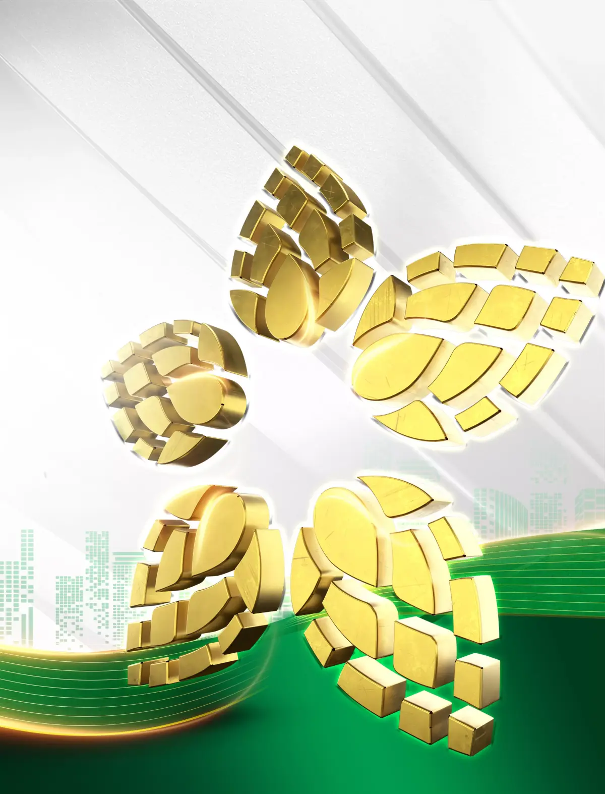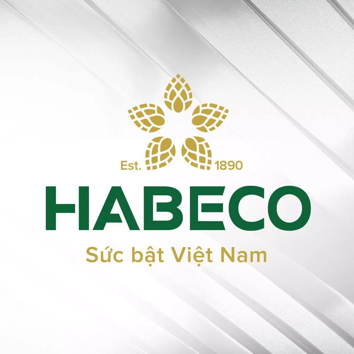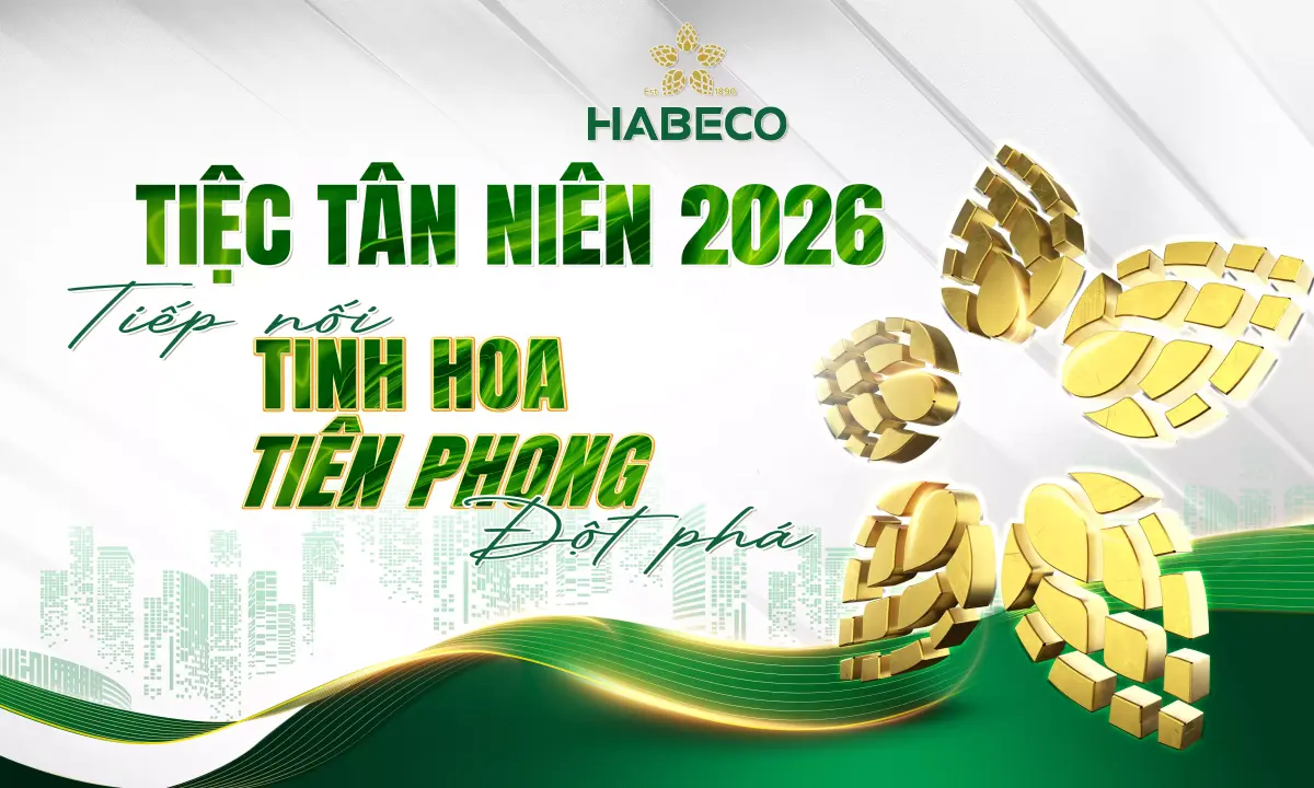 The HABECO 2026 year-end party stage is characterized by a luxurious, modern style combined with inspiration drawn directly from the Beer brand. The core idea is to honor Pioneering Quintessence (Tinh Hoa Tiên Phong), which is expressed through the signature green and gold/bronze color palette of beer, along with large barley (or hop) flower motifs prominently displayed on the central LED screen. The design utilizes a grand, robust stage structure, featuring an industrial truss system that creates a professional and stable appearance.