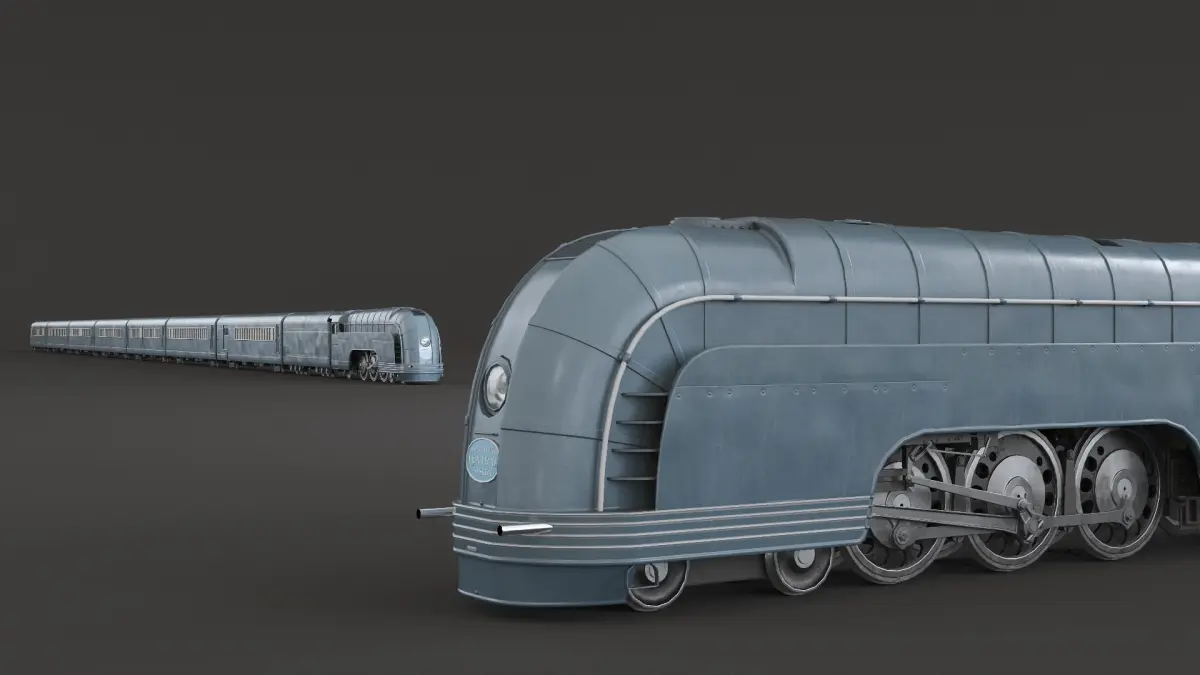For transportation history studies, industrial design education, American railway heritage, Art Deco design showcases, transportation museums, engineering exhibitions, streamlining design analysis, model train collecting, historical recreations, promotional displays, product design comparison, and educational reference in locomotive evolution.