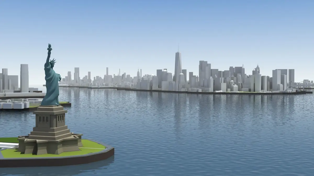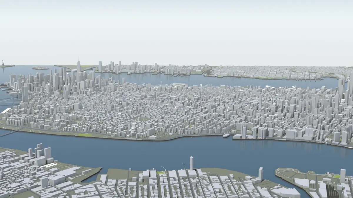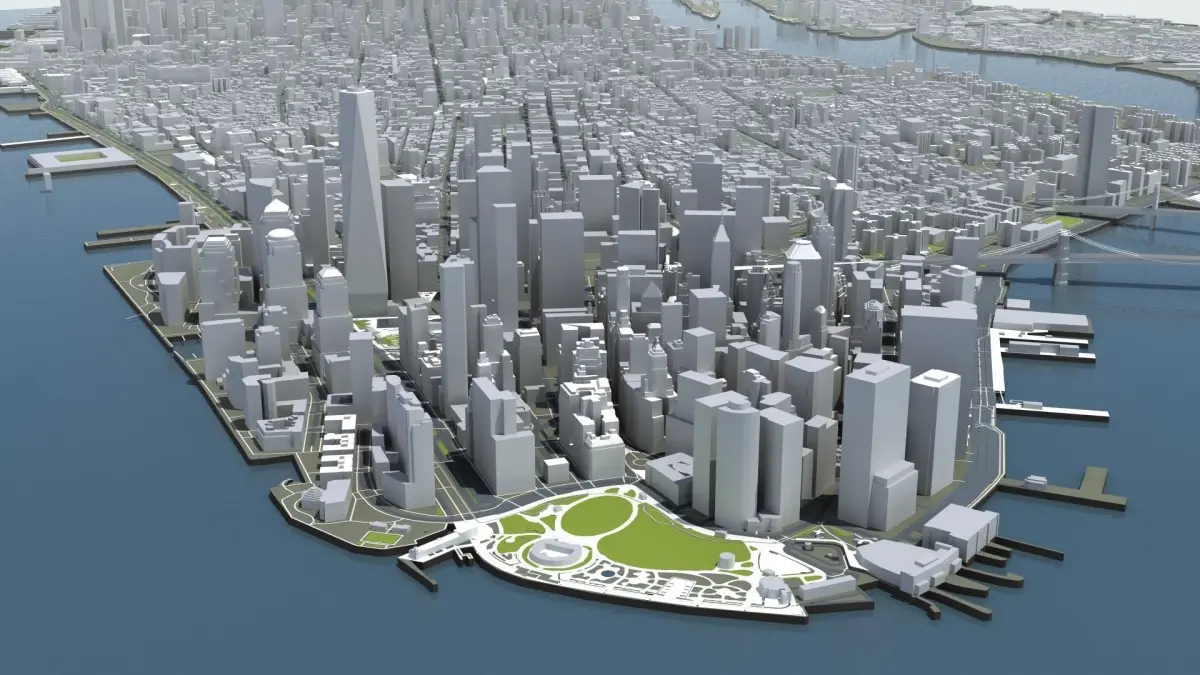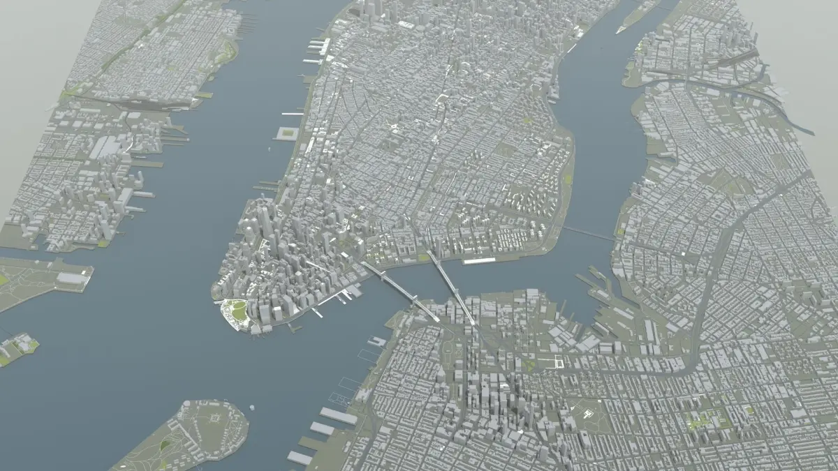 Model of New York City USA, lower Manhattan. Thousands of individual buildings in their correct real-world locations. Model covers an area approximately 10.4km x 9.2km, over 90 square km of New York, New Jersey and Brooklyn. Layers include buildings, waterways, roads and green spaces.