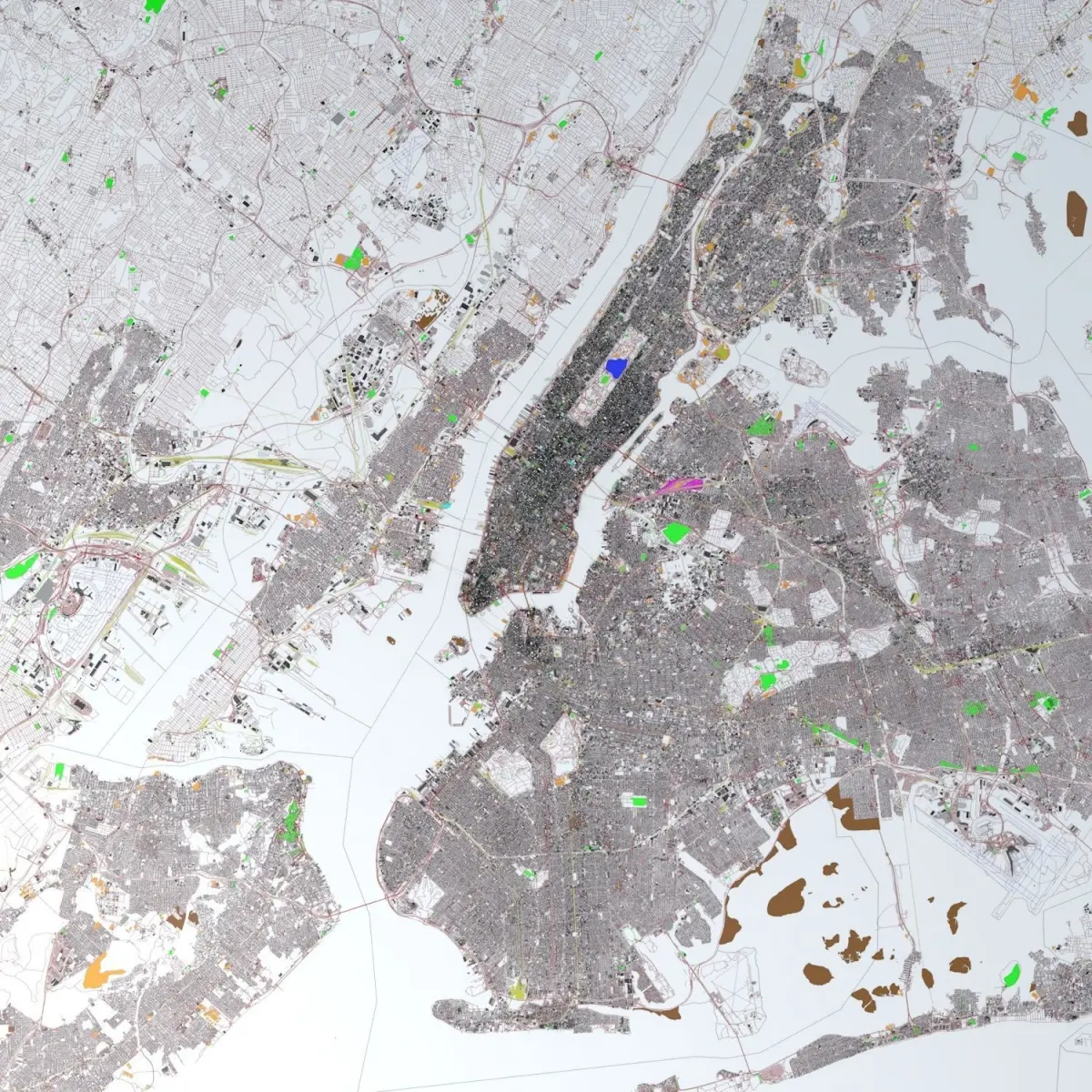 - this 3D model is based on real data therefore this is a realistic road network, streets, buildings, public transport, sport facilities, aeroways and district borders/boundaries setup of New York City, Jersey City and Newark, USAThis 3D model includes :