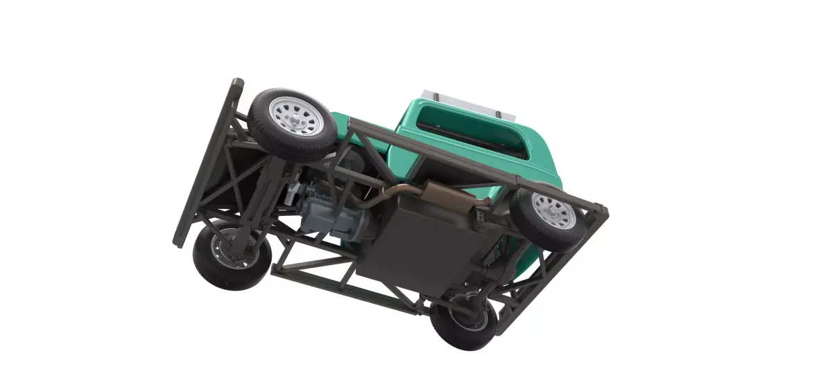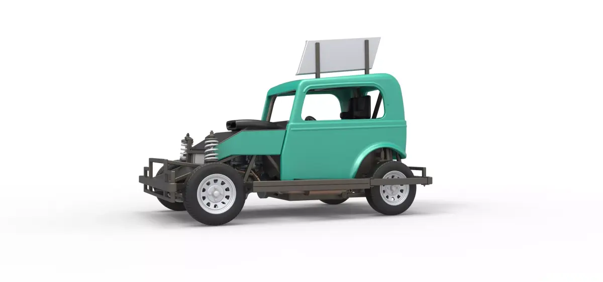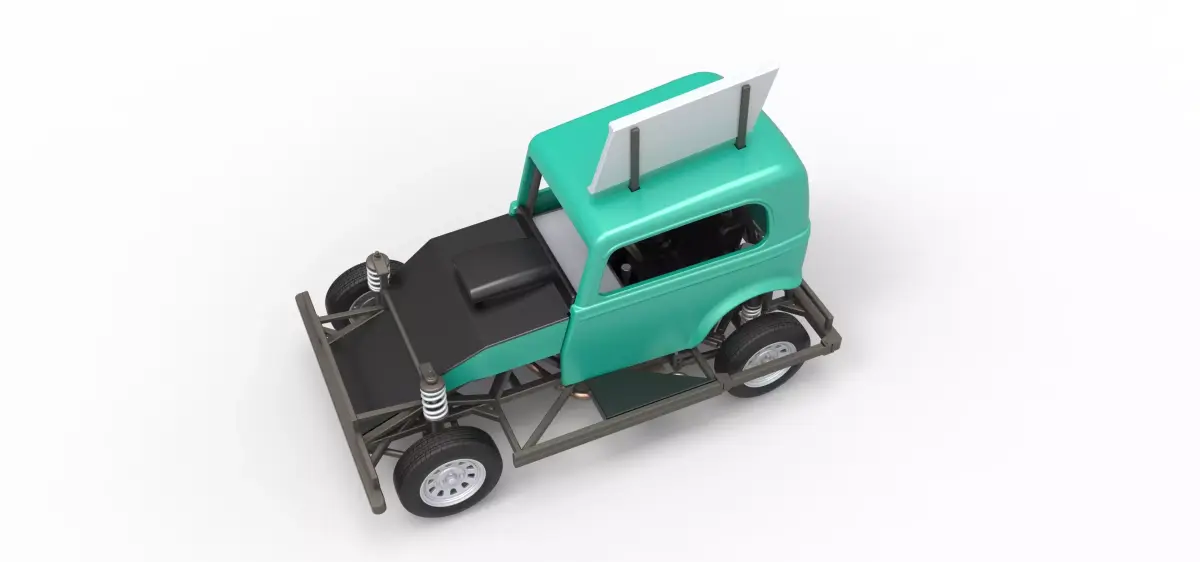 The model consists of parts: Air filter, Dashboard plate, Engine, Exhaust pipe, Fan, Frame, Front plate, Hood, Radiator, Rims, Seat part 1,2, Shell, Shifter, Side bars, Side plate, Steering wheel, Tank, Tires, Top wing.