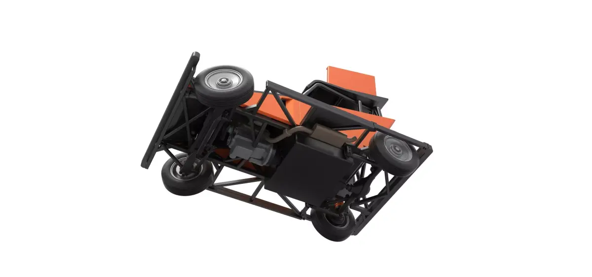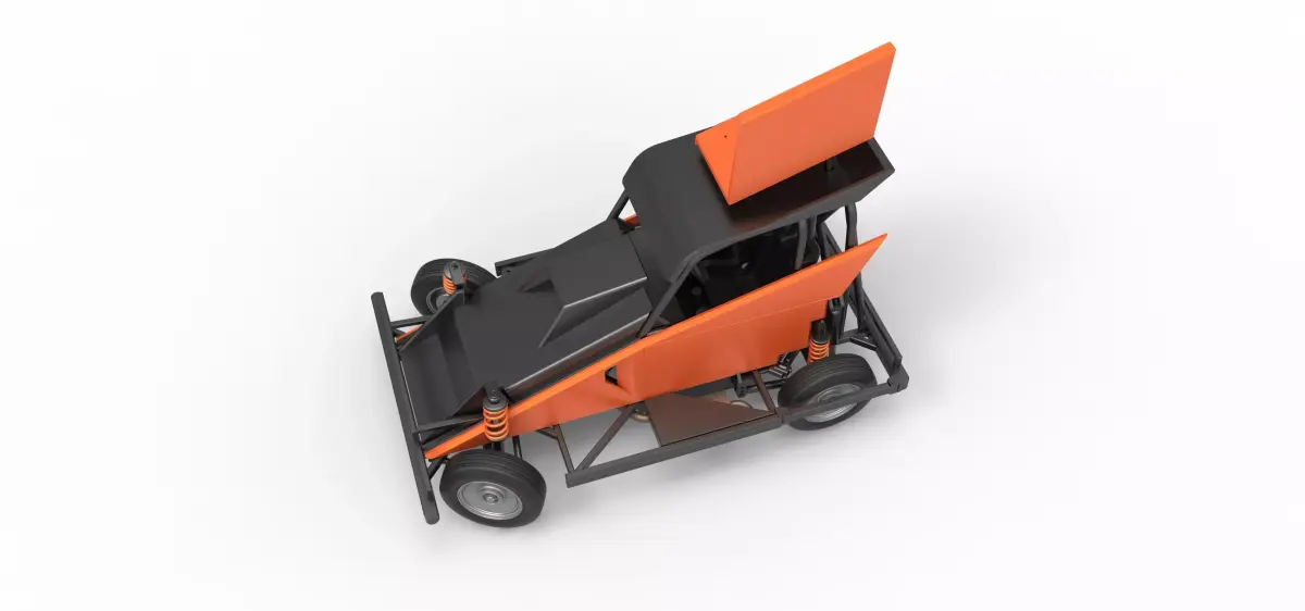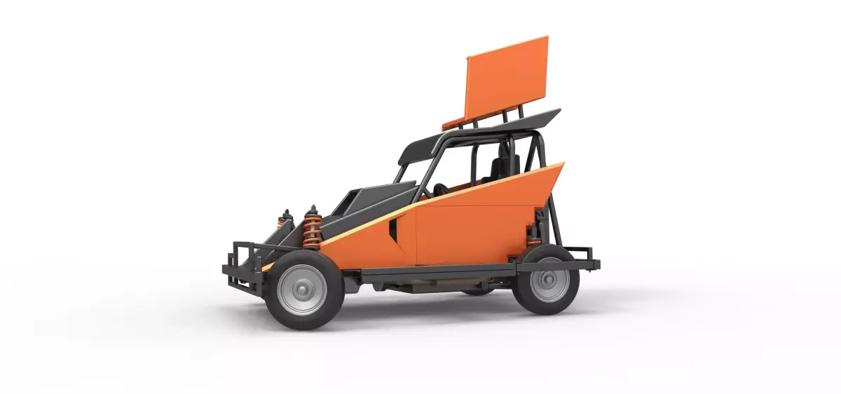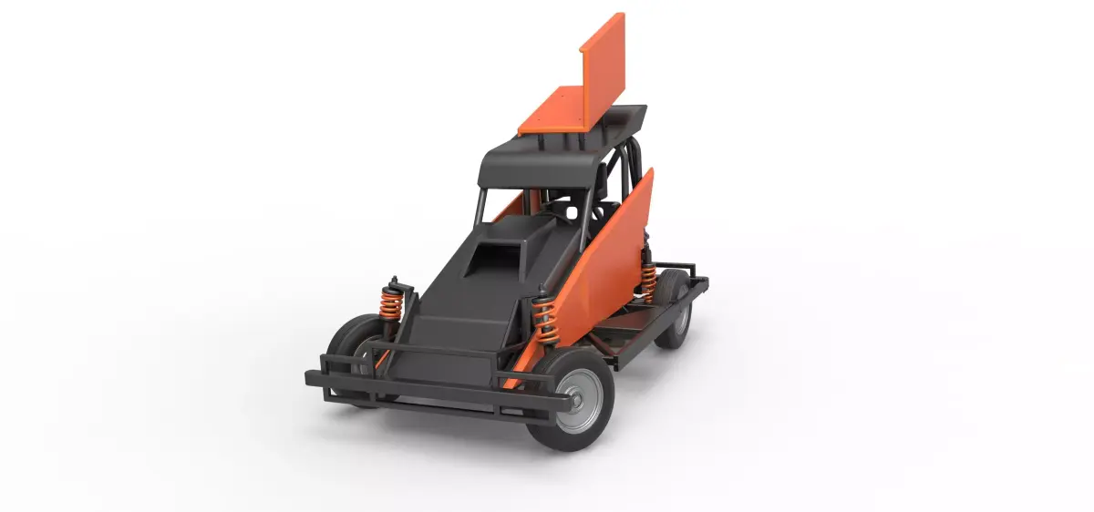The model consists of parts: Air filter, Dashboard plate, Engine, Exhaust pipe, Fan, Frame, Hood, Left side plate 1-3, Radiator, Right side plate 1,2, Rims, Roof, Seat part 1,2, Shifter, Side bars, Steering wheel, Tank, Tire, Top wing.