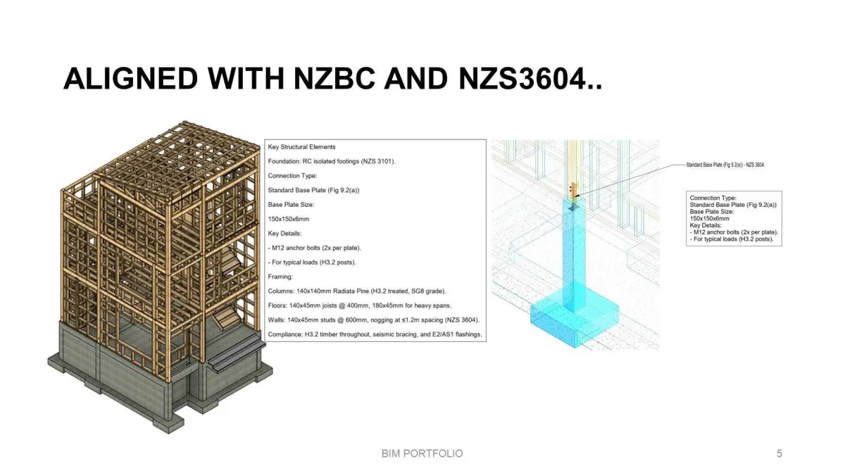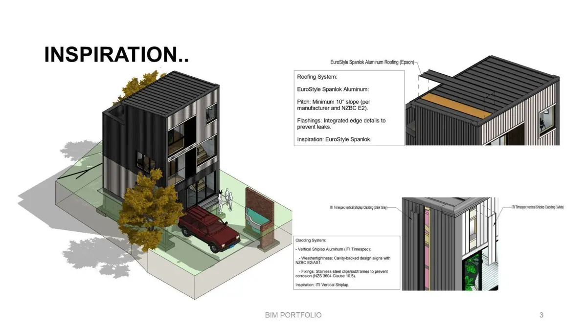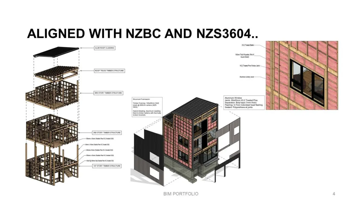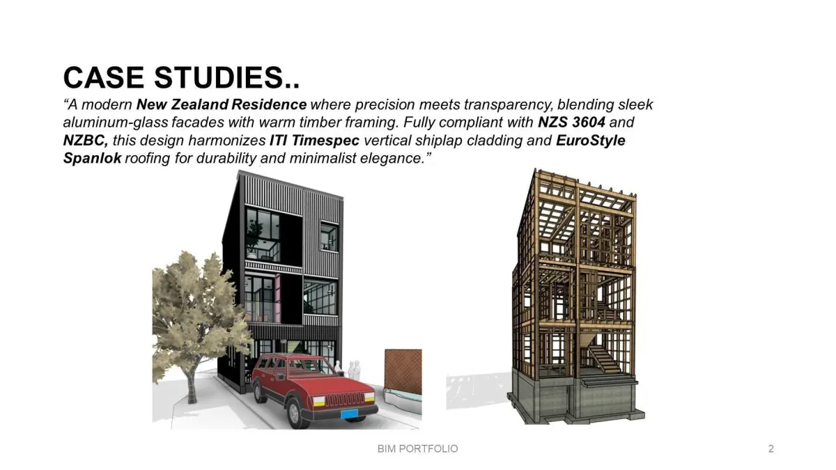 “A modern New Zealand Residence where precision meets transparency, blending sleek aluminum-glass facades with warm timber framing. Fully compliant with NZS 3604 and NZBC, this design harmonizes ITI Timespec vertical shiplap cladding and EuroStyle Spanlok roofing for durability and minimalist elegance.”Software – Autodesk Revit 2024
