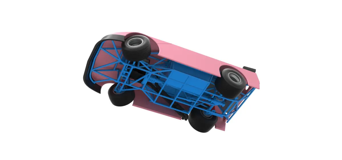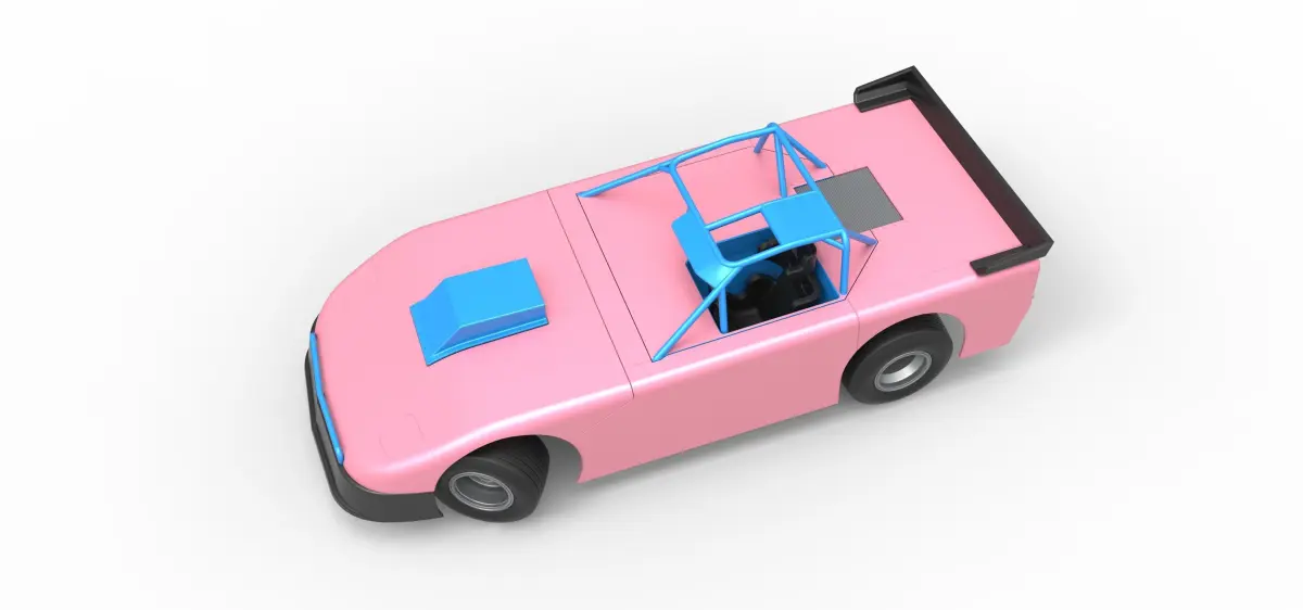 The model consists of parts: Air filter cover, Air filter, Air intake, Body, Engine, Exhaust tubes, Front bumper, Front rims, Front tires, Left exhaust pipes, Nose, Radiator, Rear left tire, Rear right tire, Rear rims, Right exhaust pipes, Rim covers, Scoop, Seat part 1,2, Shell, Shifter, Spoiler, Steering wheel, Tank.