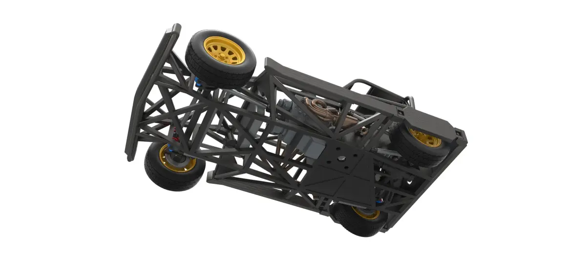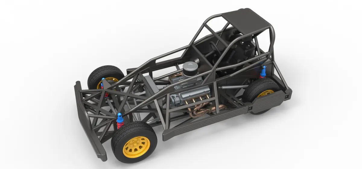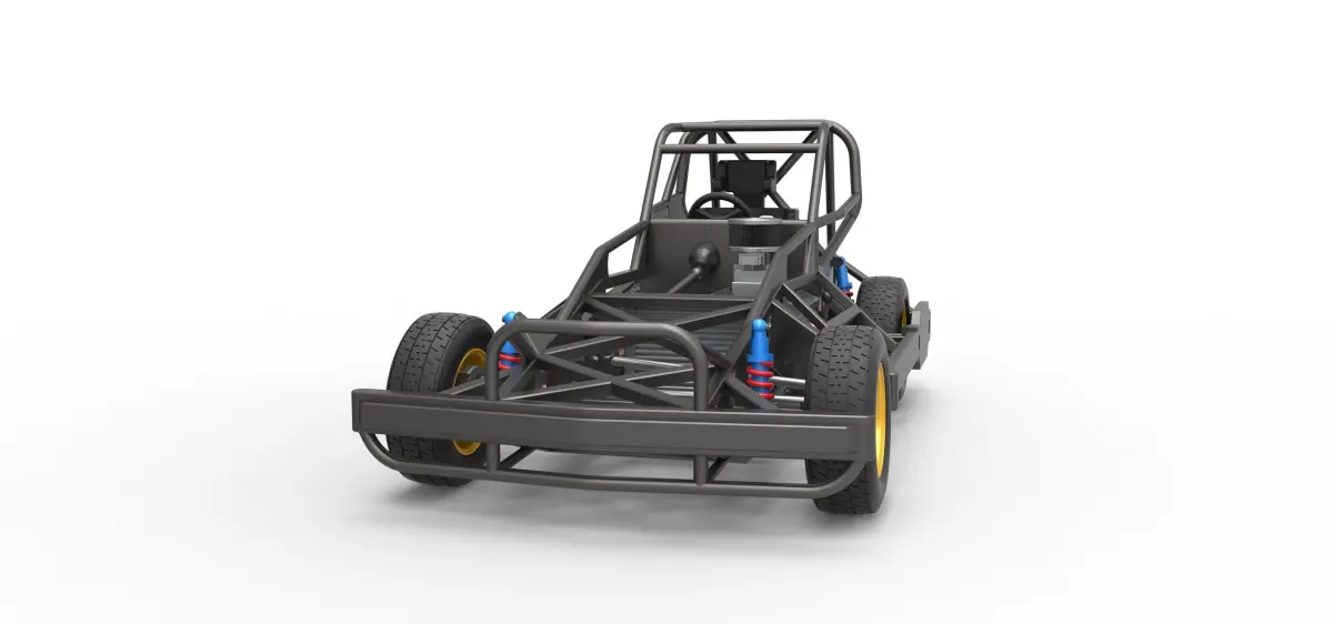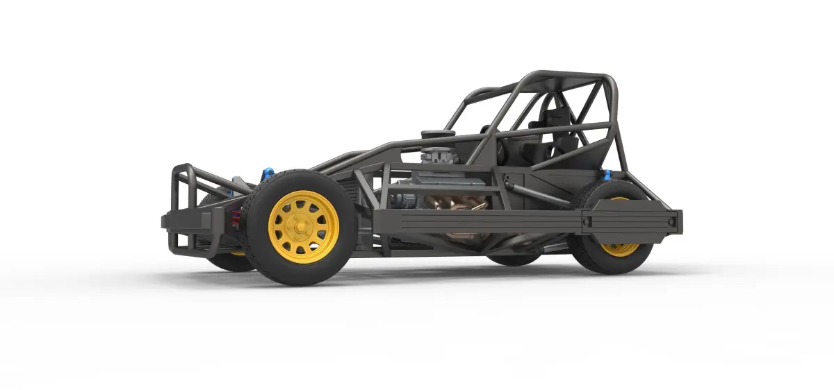 The model consists of parts: Air filter cap, Air filter, Air intake, Body, Box, Engine, Front rims, Fuel tank, Left exhaust part 1,2, Radiator, Rear right tire, Rear rims, Rear wheel guards, Right exhaust part 1,2, Seat part 1,2, Shifter, Steering shaft, Steering wheel, Tires.