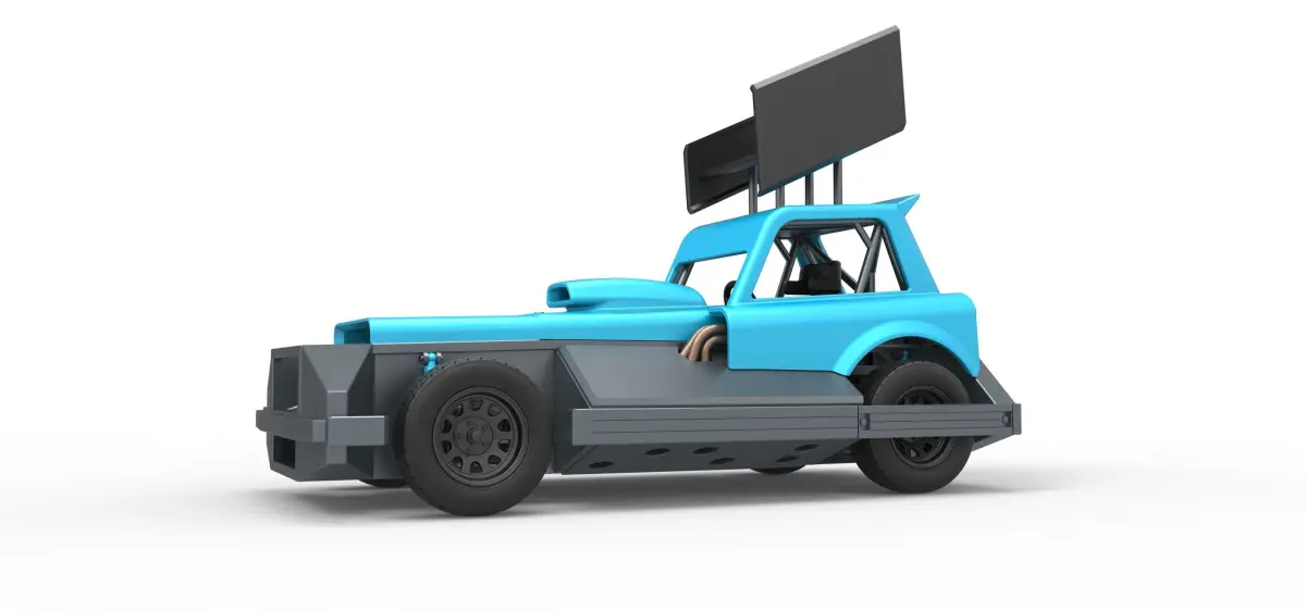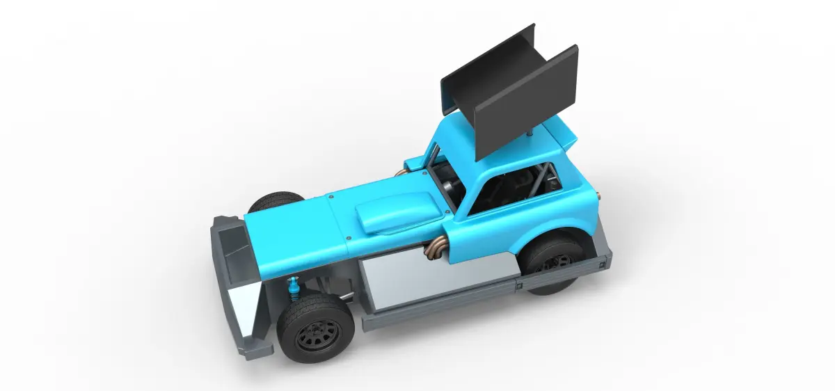The model consists of parts: Air filter cap, Air filter, Air intake, Body, Box, Engine, Exhaust ends, Front rims, Fuel tank, Hood part 1,2, Left exhaust pipes, Left shell, Radiator, Rear right tire, Rear rims, Rear wheel guards, Right exhaust pipes, Right shell, Seat part 1,2, Shell central part, Shifter, Spoiler, Steering shaft, Steering wheel, Tires, Top wing stand 1,2, Top wing.