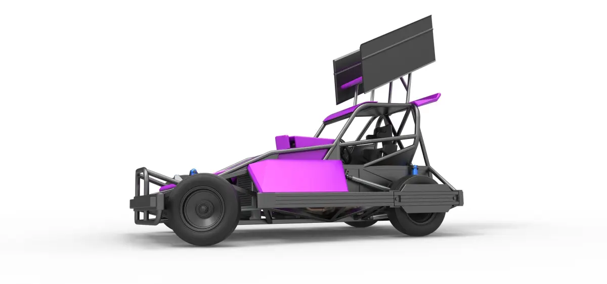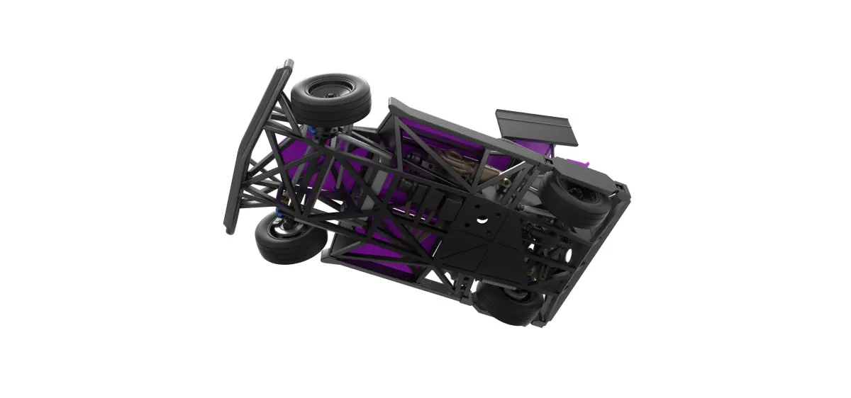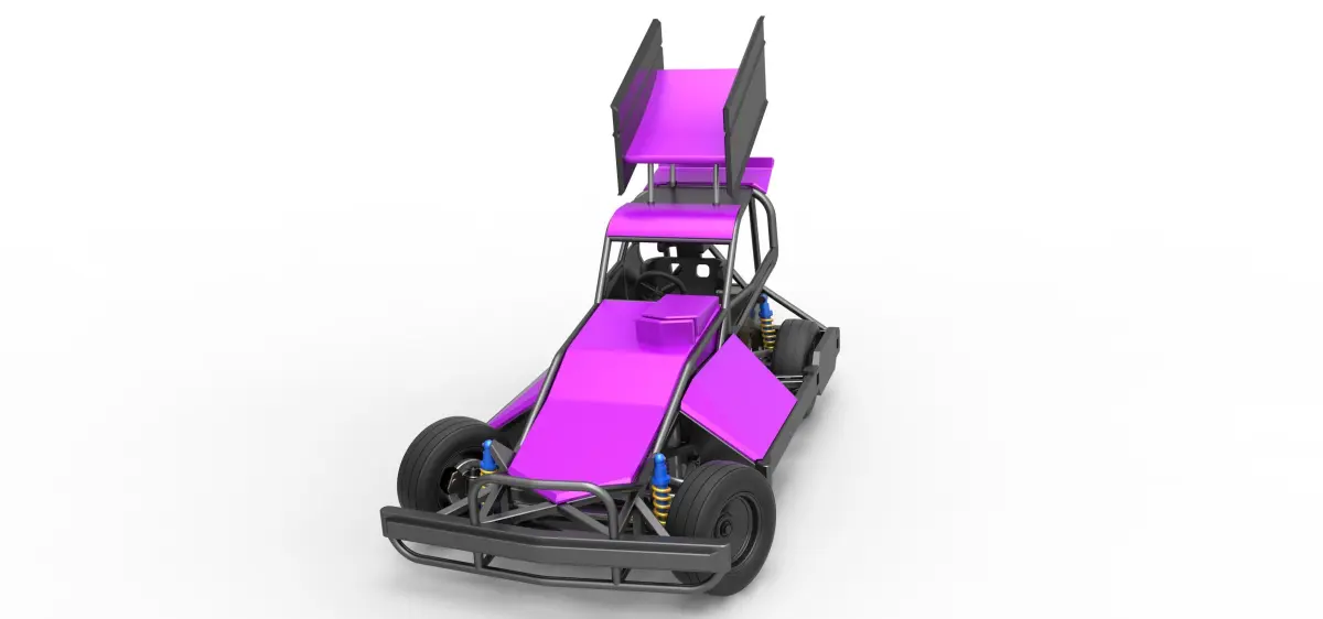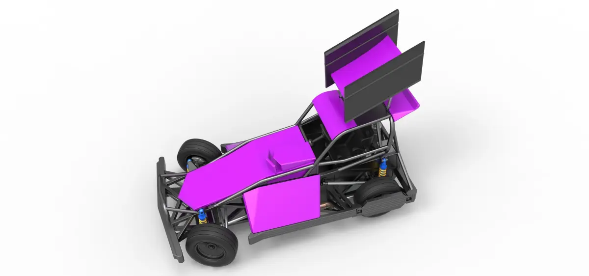 The model consists of parts: Air filter cap, Air filter, Air intake, Body, Box, Engine, Front rims, Fuel tank, Hood, Left exhaust part 1,2, Left shell, Radiator, Rear right tire, Rear rims, Rear wheel guards, Right exhaust part 1,2, Right shell, Seat part 1,2, Shifter, Spoiler, Steering shaft, Steering wheel, Tires, Top wing, Visor.