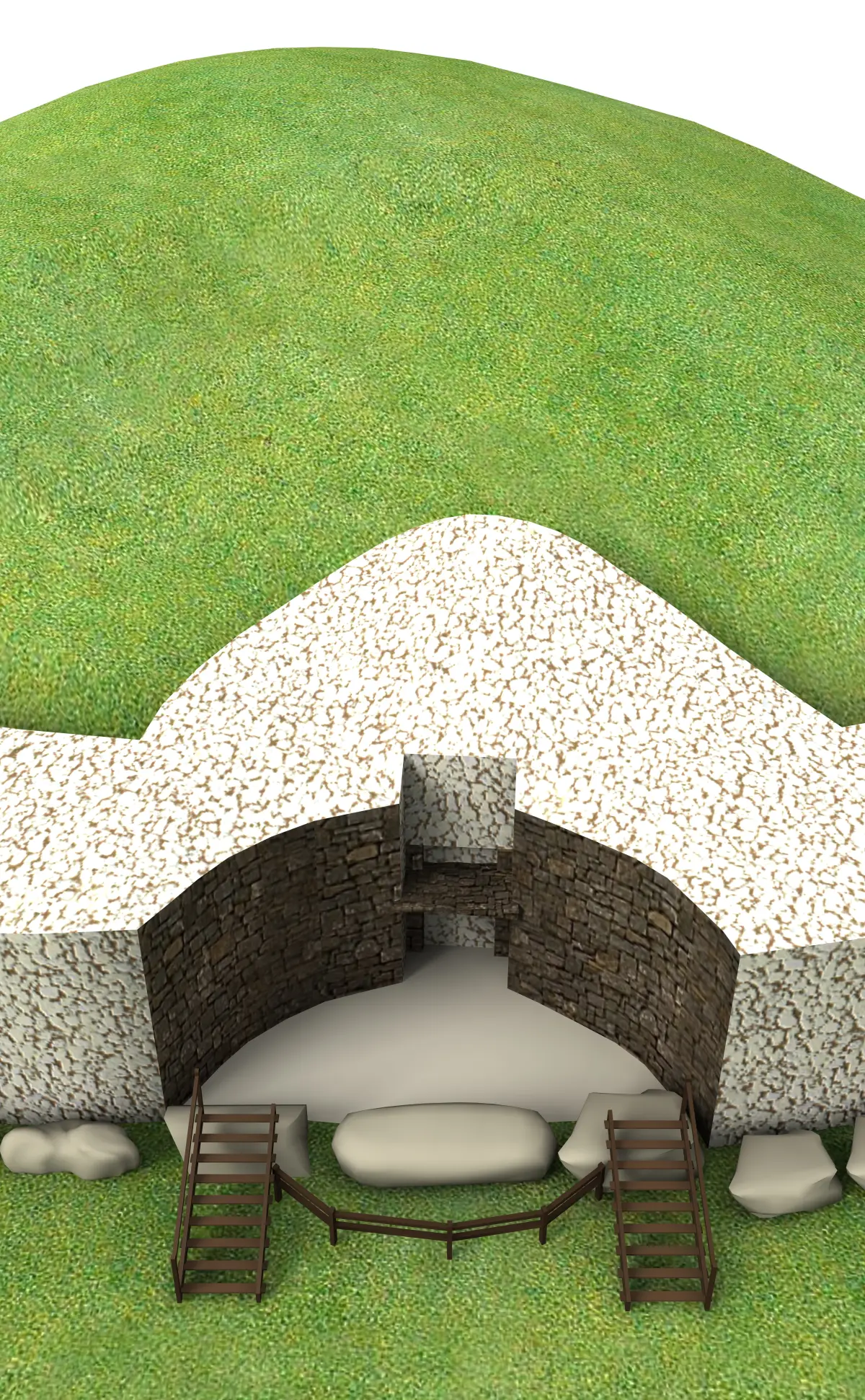 Newgrange is an enormous burial mound in Ireland. It is situated in the Irish country of Meath, on the Boyne River. The tomb is a so-called passage tomb with a cruciform chamber and a corbelled vault. This type is rare, but has also been found on the islands of Anglesey and Orkney.