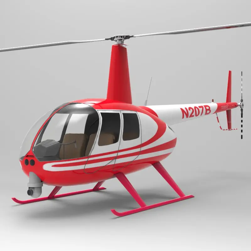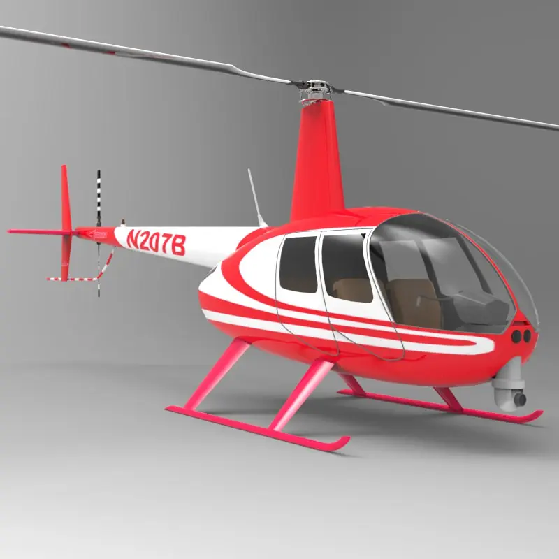 The R44 helicopter can carry a camera on its nose, under the belly, or on small wings. This version includes a camera mounted on the nose.
