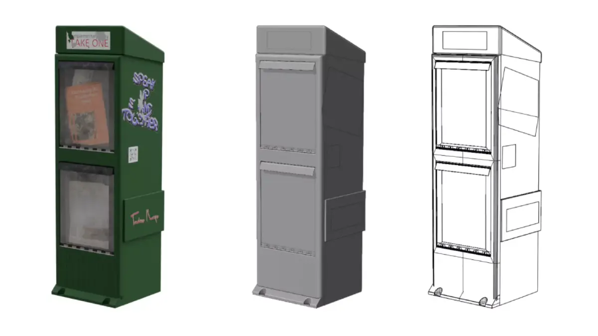 A collection of newsstands with their own unique publications.Placeable at various urban settings.