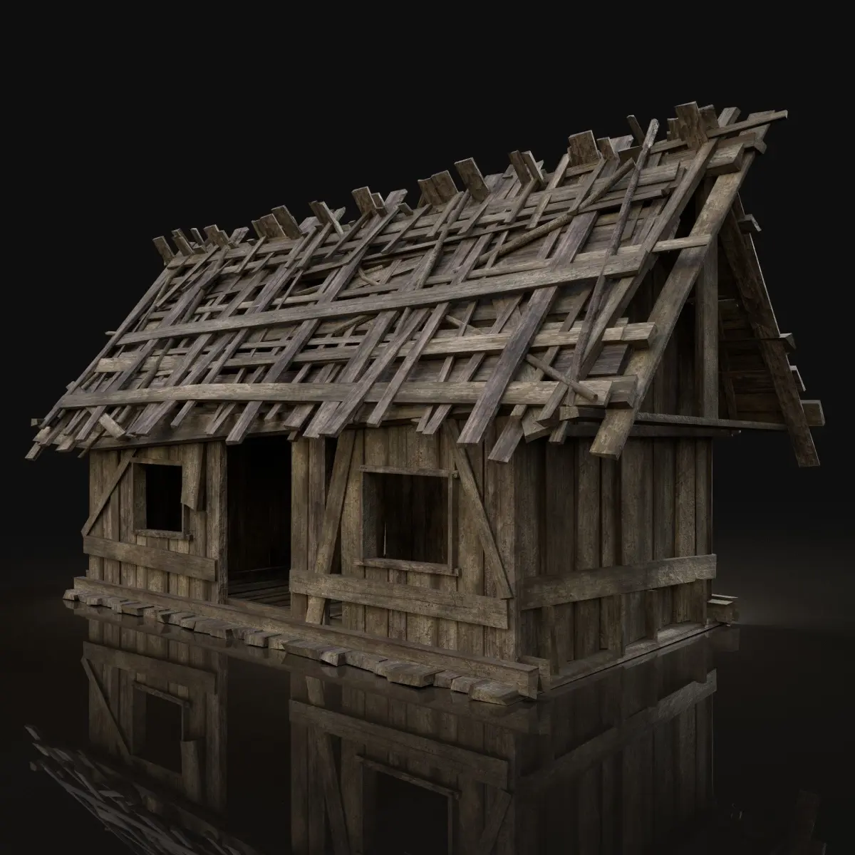 Model of simple wooden swamp hut, fully enterable, perfect for your game.