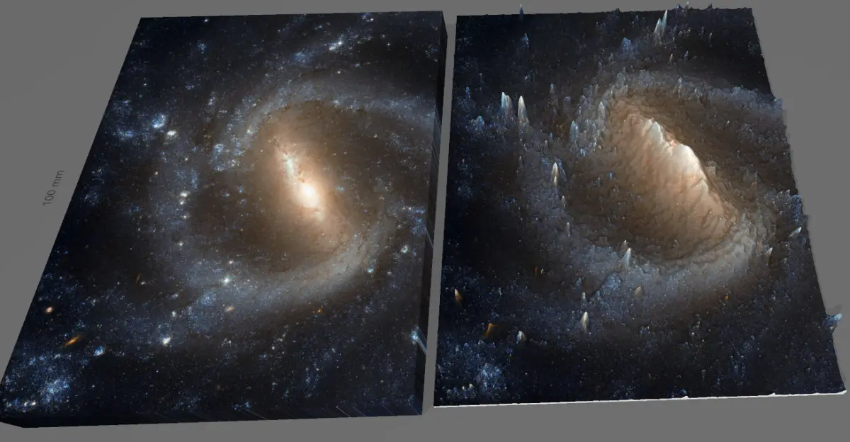 3D image obtained as a result of soft analysis of the 2D images of the new Hubble Space Telescope. The technique based on color analysis highlights the light of stars and ionized gases from the darkness of space, as gravity curves space, thus creating a spatially interpretable high-resolution 3-dimensional work.