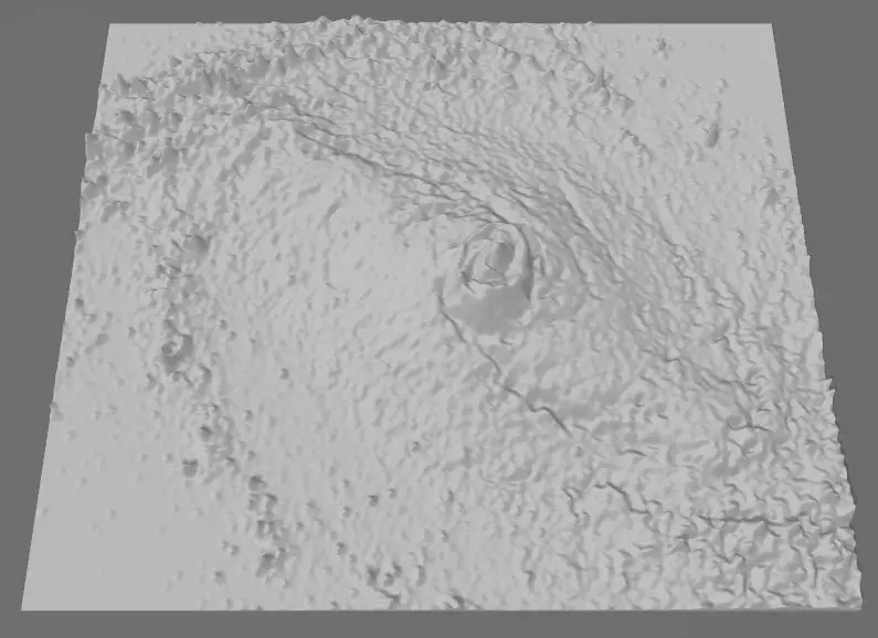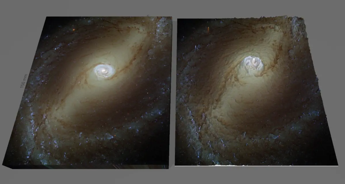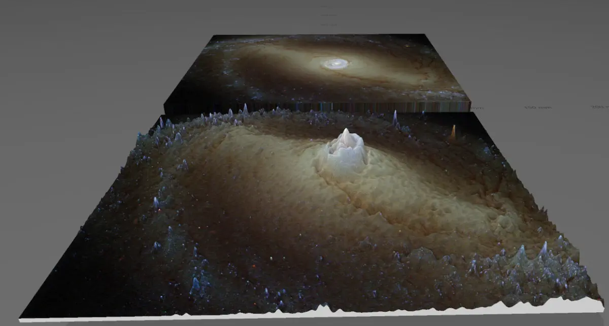 Huge Galaxy, whose light traveled thousand years for the our Spaces Telescope to record its photons! Where the material becomes denser, as a result of physical processes, it will be brighter and warmer, like as the sun! Somehow, the thickening matter creates deeper and deeper holes in space-time. Based on this, I created the negative gravity map of the image with the help of software, as gravity distorts a deep pit in space-time, the texture rises on the model, thus creating gravity mountains!